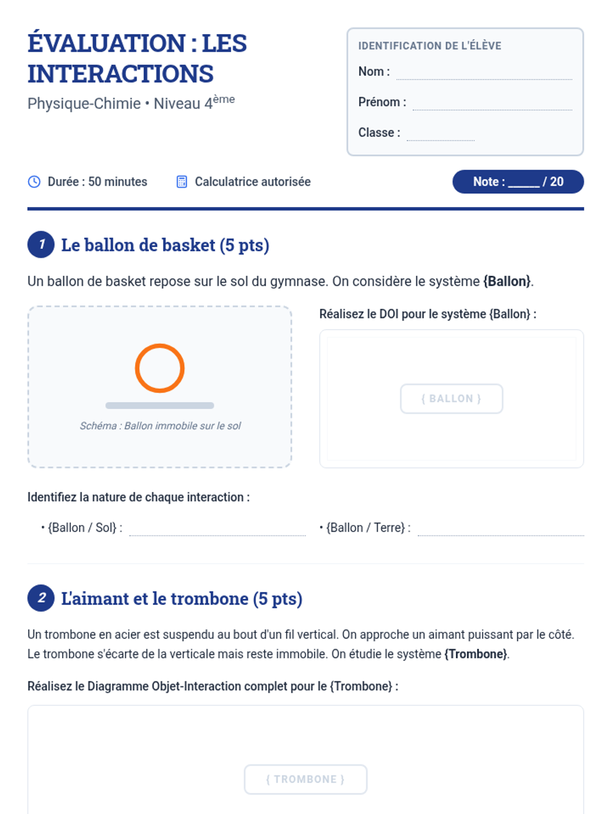 Une évaluation de physique-chimie de 50 minutes pour le niveau 4ème, centrée sur les interactions et les forces. Elle demande aux élèves de construire des DOI et de représenter des vecteurs forces avec précision. Version corrigée pour le layout et les rendus LaTeX.