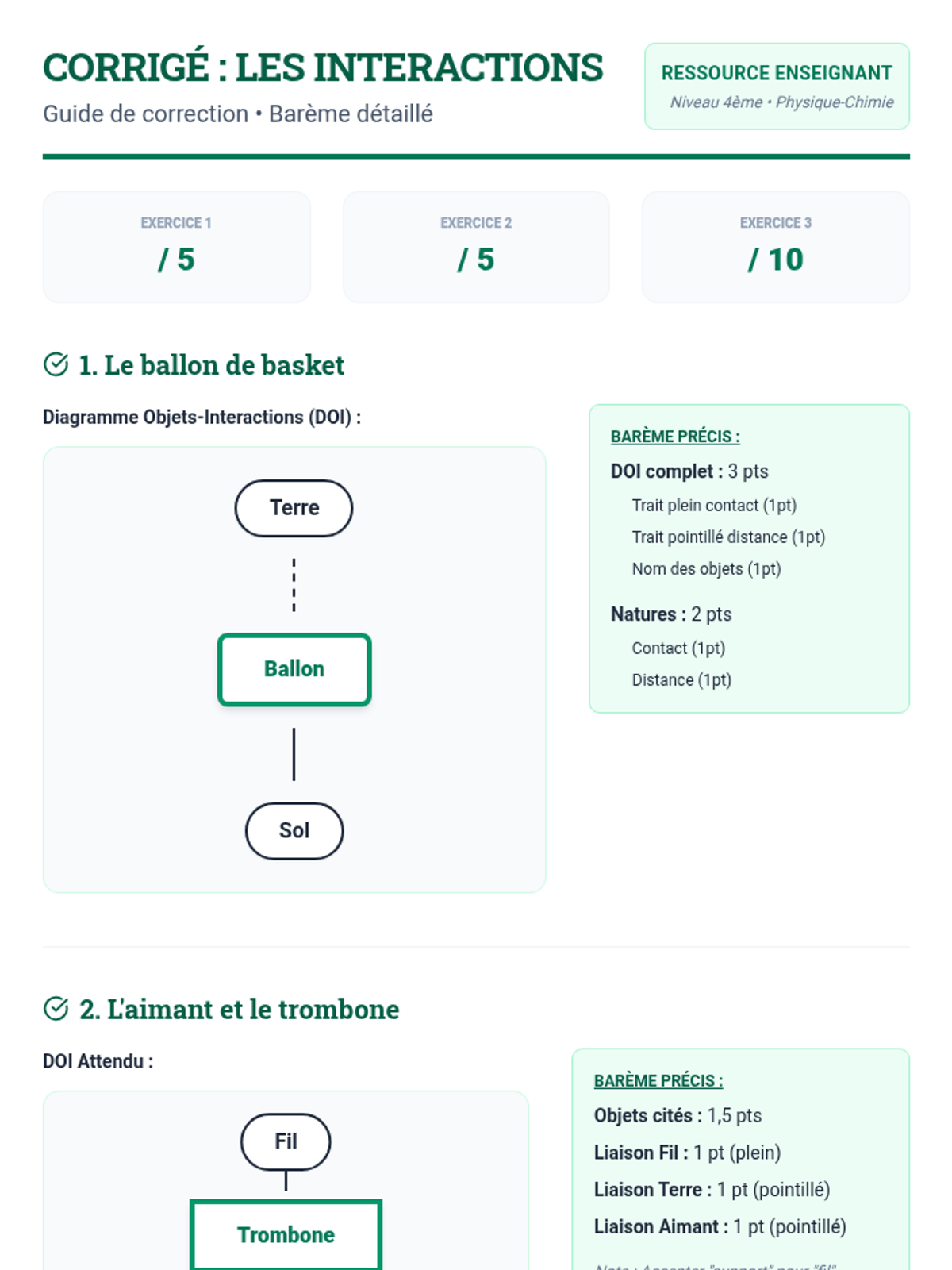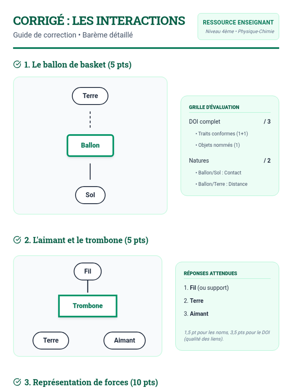 Le corrigé détaillé de l'évaluation sur les interactions, incluant le barème par question et les solutions graphiques attendues pour les DOI et les vecteurs.