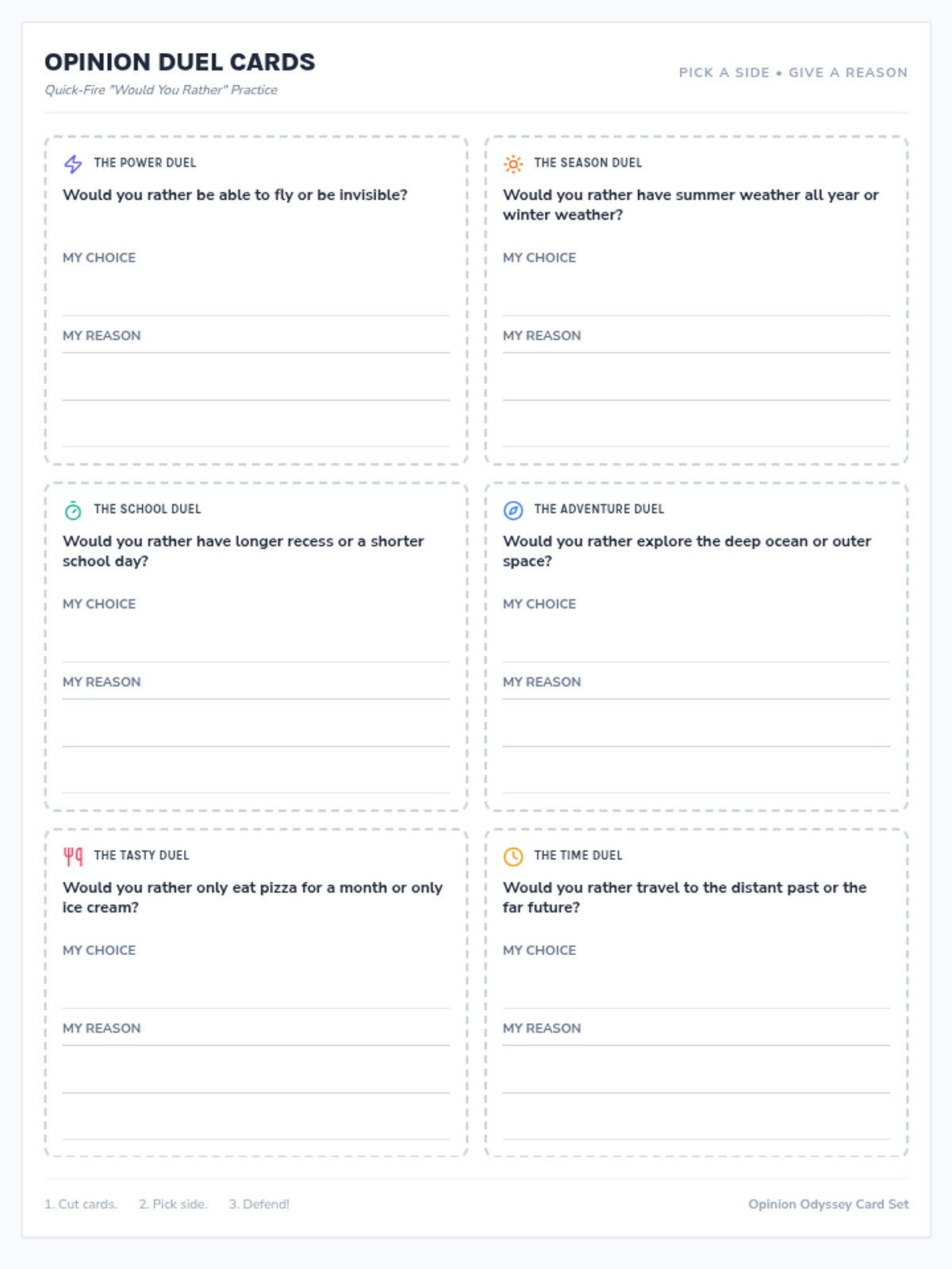 A comprehensive graphic organizer for 4th-grade students to plan their opinion writing, featuring sections for a claim, two supporting reasons, a conclusion, and a final self-check.