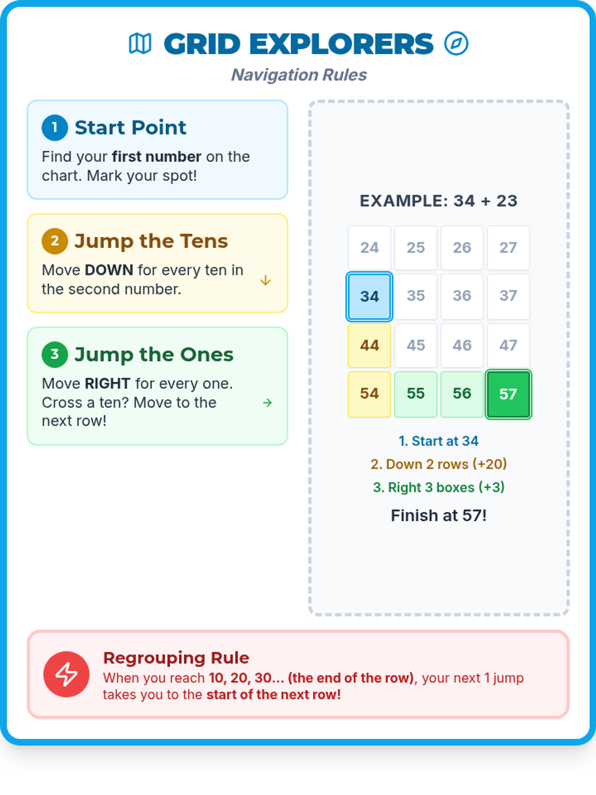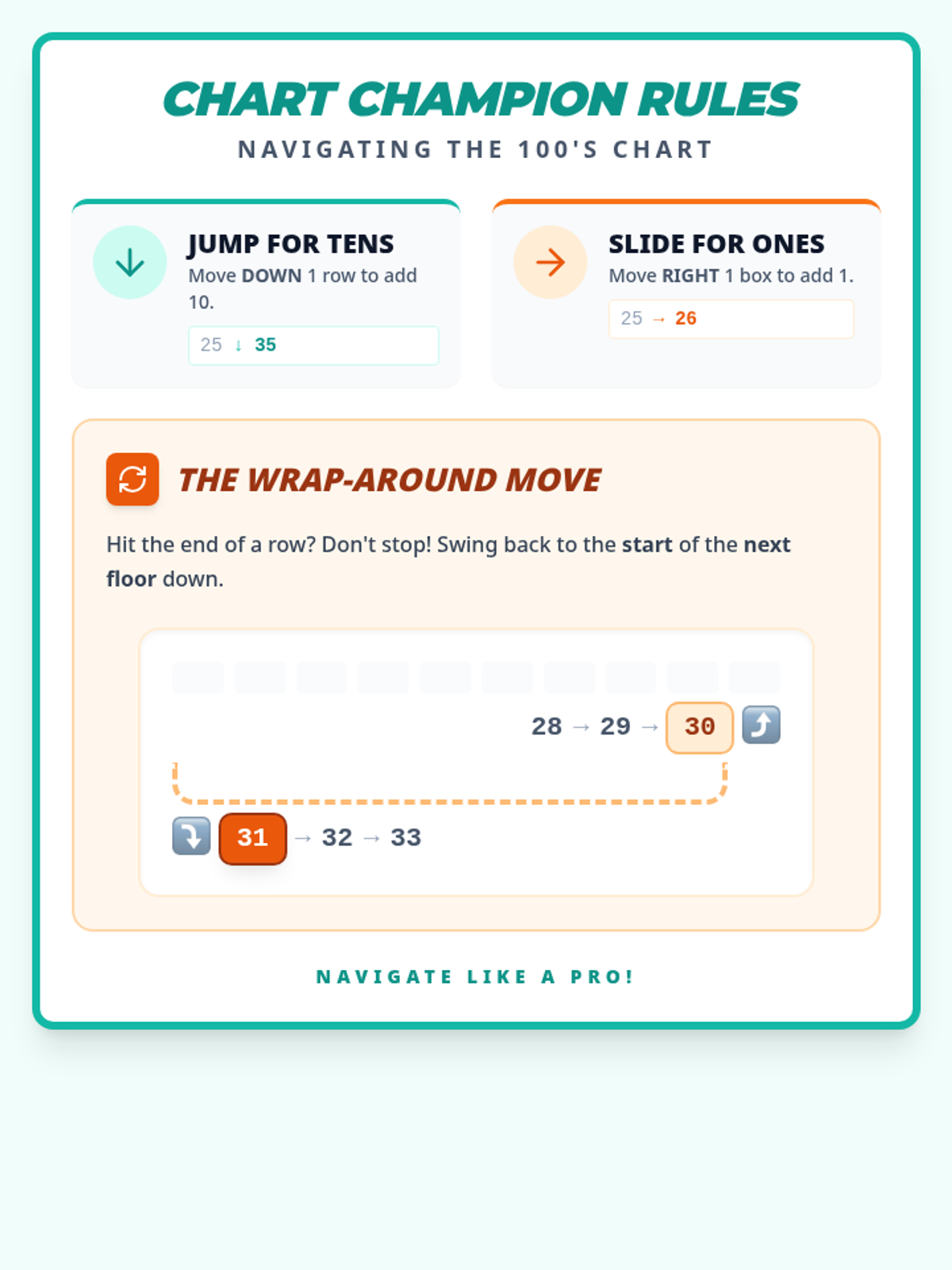 A high-visibility anchor chart illustrating the three main rules for adding with a 100's chart: jumping down for tens, sliding right for ones, and the 'wrap-around' technique for regrouping at the end of a row. Ideal for classroom display or student reference folders.