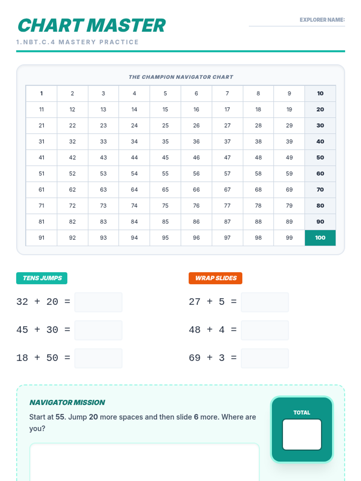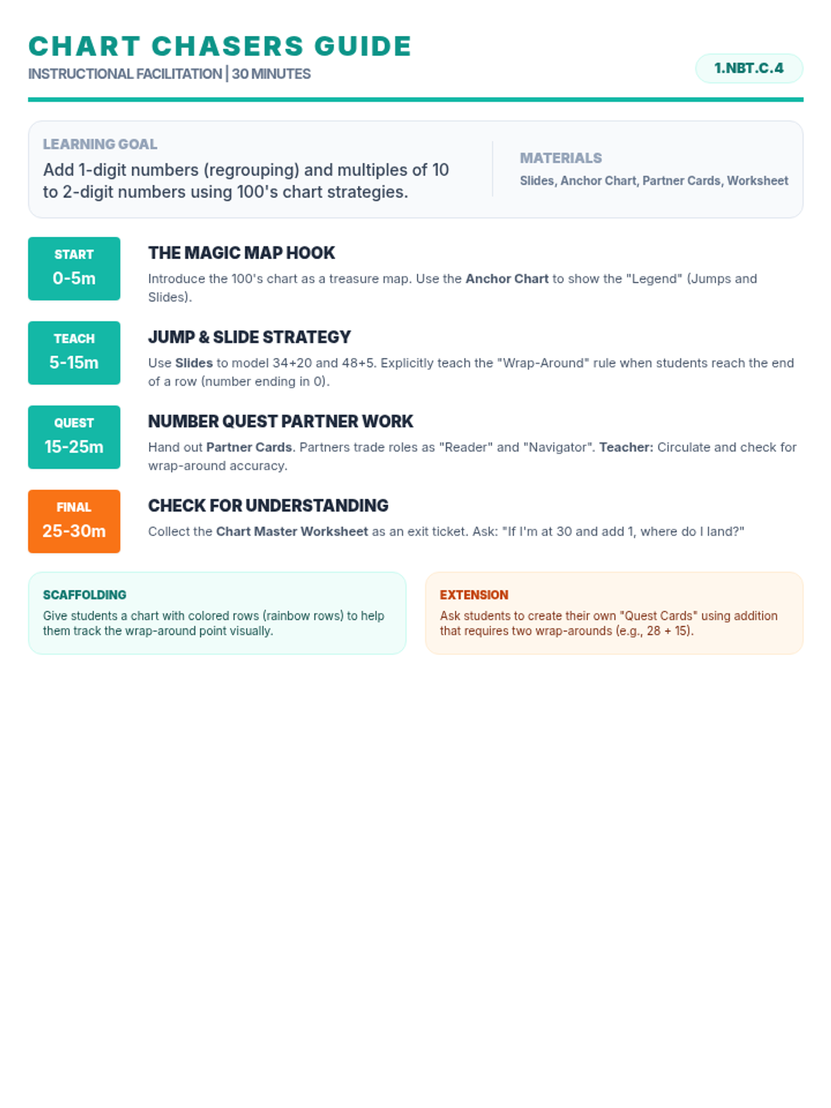 Teacher-facing facilitation guide for a 30-minute lesson on 100's chart addition. Includes pacing, instructional strategies for regrouping (the 'wrap-around' method), and differentiation tips for various learner levels.