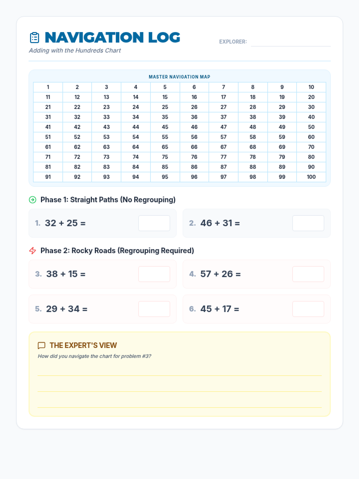 A two-digit addition practice worksheet using a hundreds chart, organized into sections with and without regrouping. Includes an area for students to explain their reasoning.