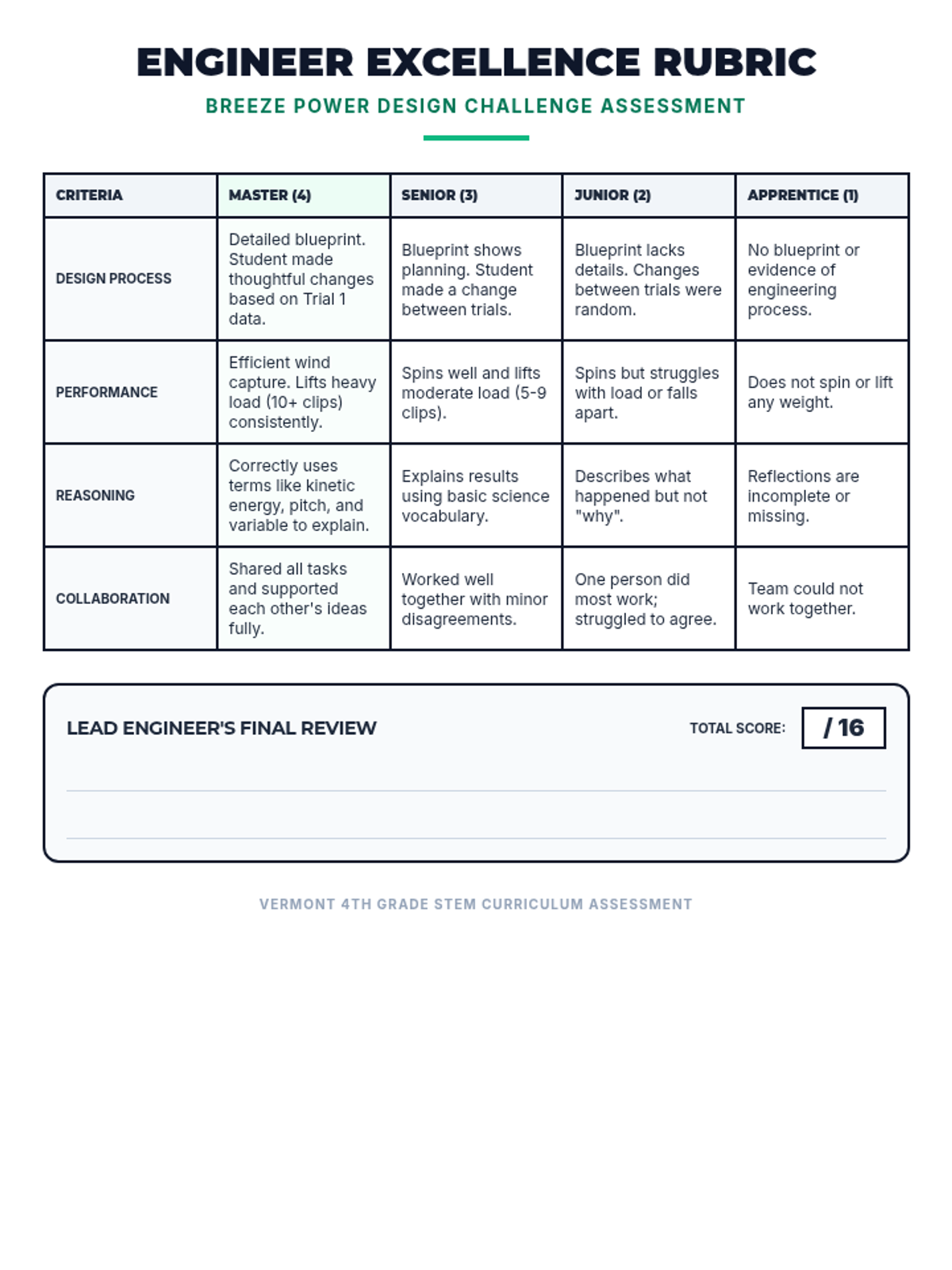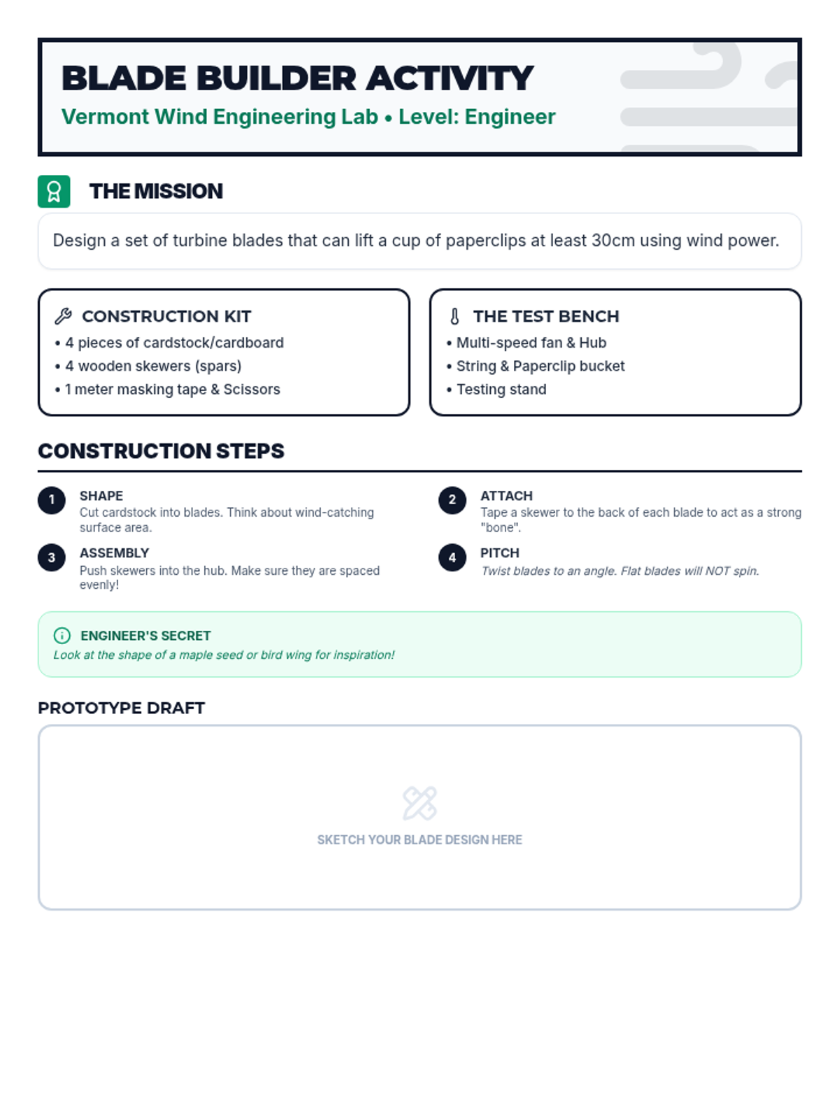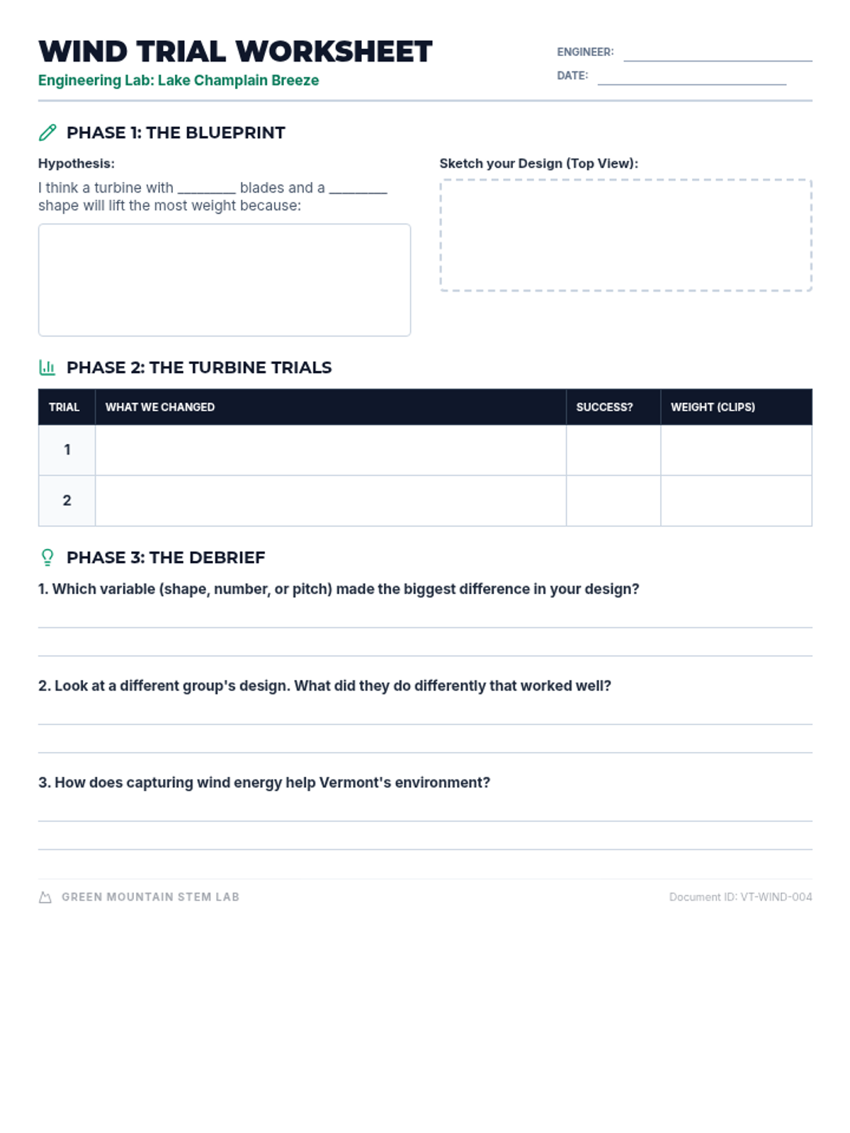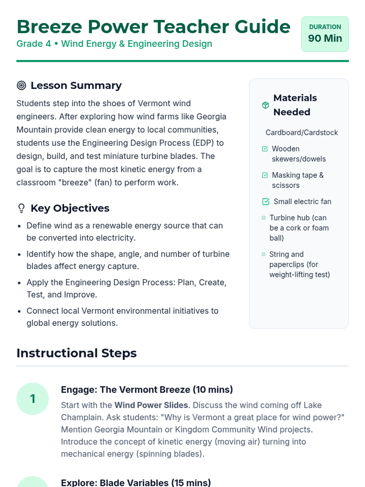 A comprehensive teacher guide for leading the wind energy engineering lesson, featuring Vermont-specific context, instructional steps, and classroom management tips.