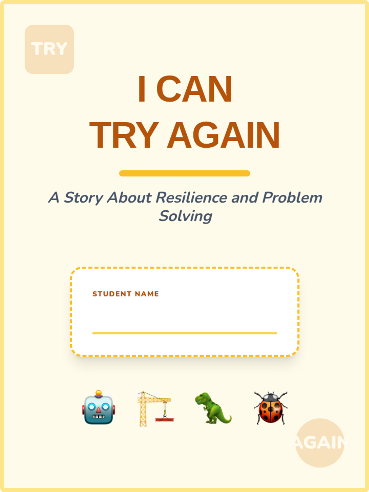 A multi-page social story book focused on resilience and perseverance. Teaches students how to stay calm and try again when things go wrong, using engaging themes like robots, dinosaurs, and planes. Includes examples of working with a friend to solve problems.