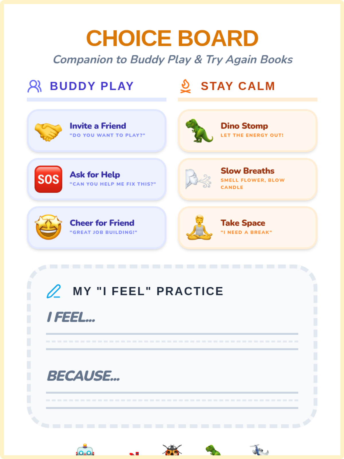 A choice board for students to visually select friendship and emotional regulation strategies. Includes a guided section for practicing "I feel" statements with clear primary-ruled handwriting areas. Features interactive strategies like asking for help and inviting friends.