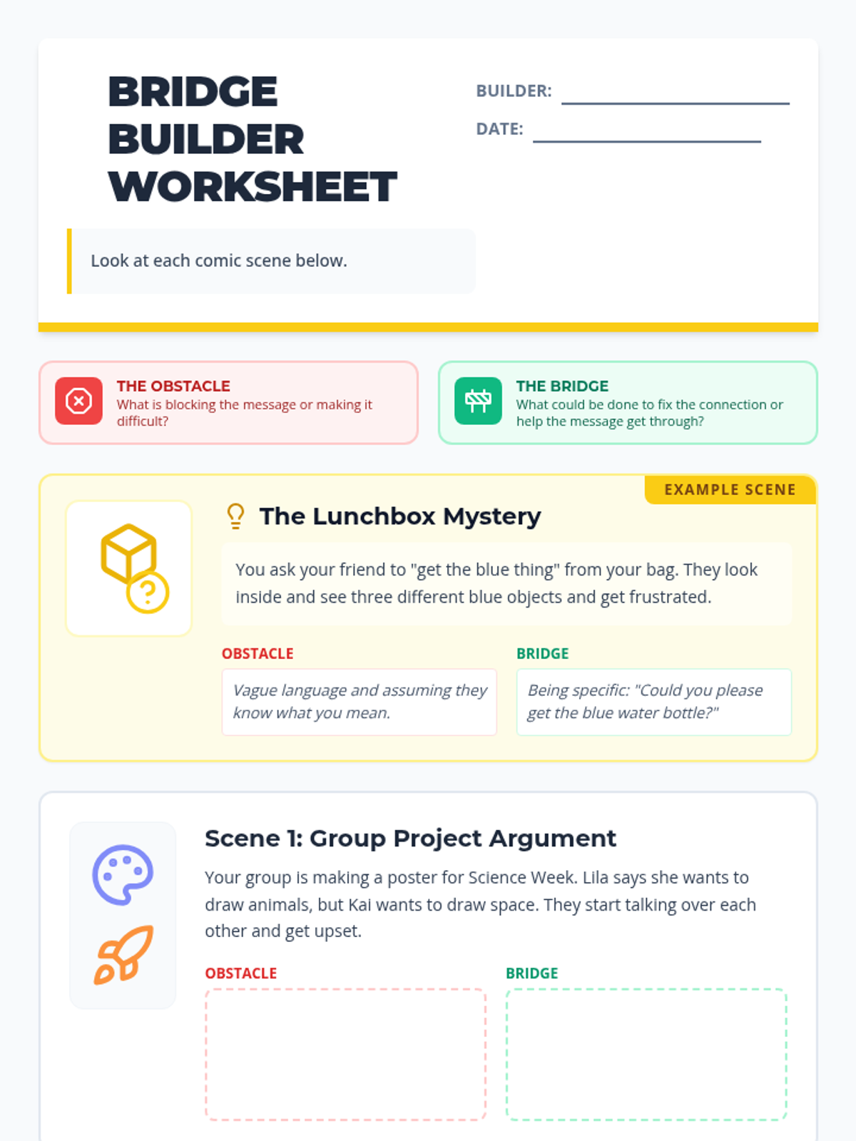 A scenario-based worksheet where students identify 'obstacles' and 'bridges' in various communication situations. Features large visual icons and updated scenarios for Year 6 students.