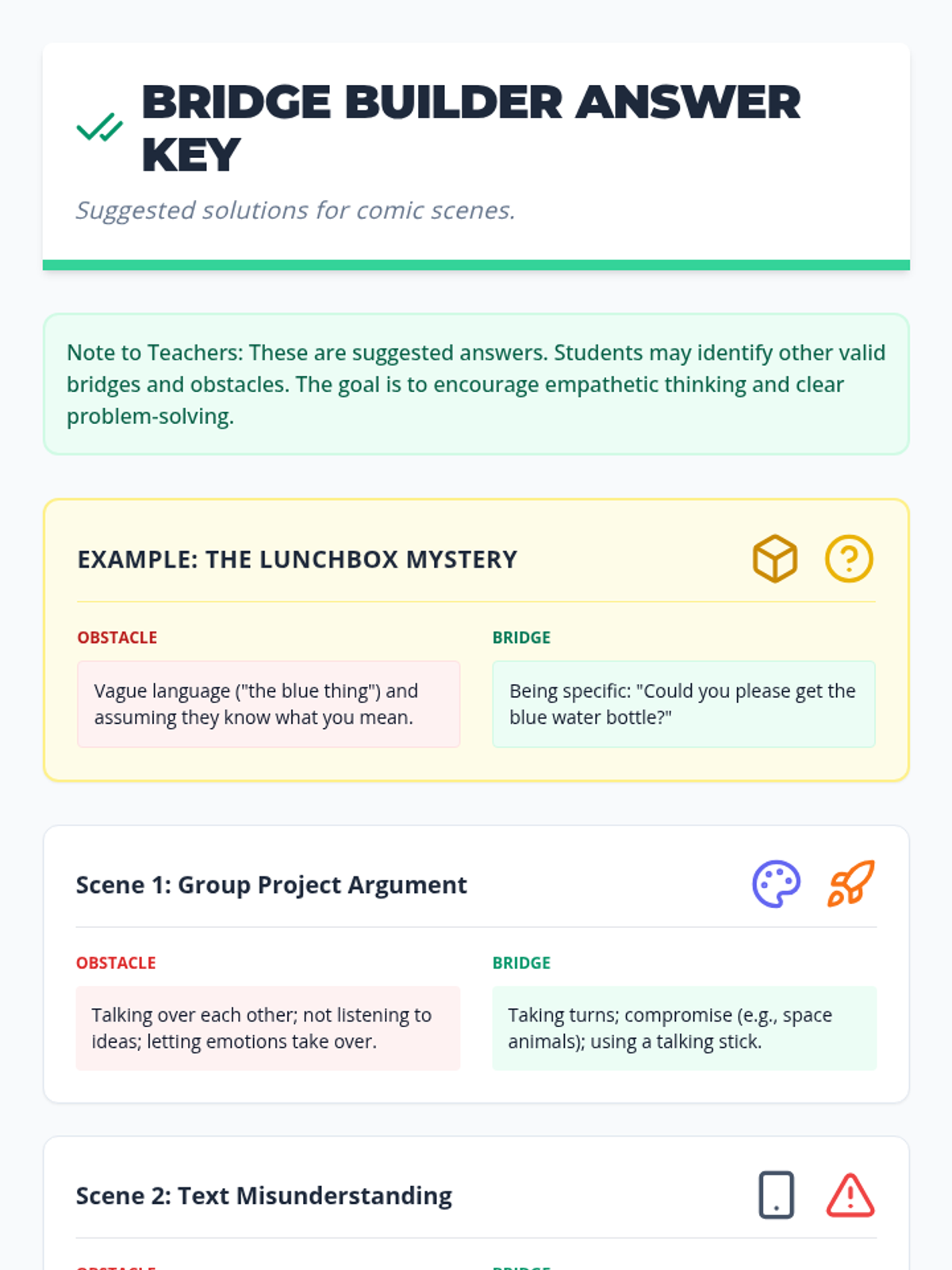 A comprehensive answer key for the Bridge Builder Worksheet, providing suggested bridges and obstacles for each scenario. Features matching large icons for easy teacher reference and updated card game scenario.
