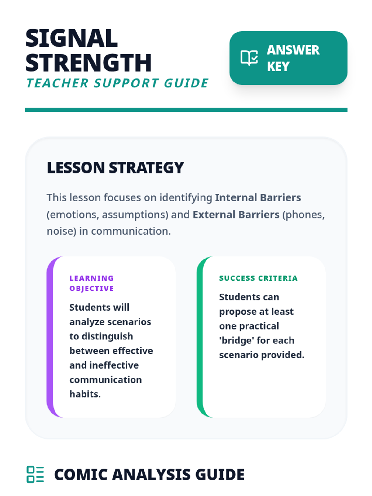 A comprehensive teacher's guide for the Signal Strength lesson. It includes an answer key for the comic strip scenarios, instructional tips, learning objectives, and extension activity suggestions to deepen student understanding.