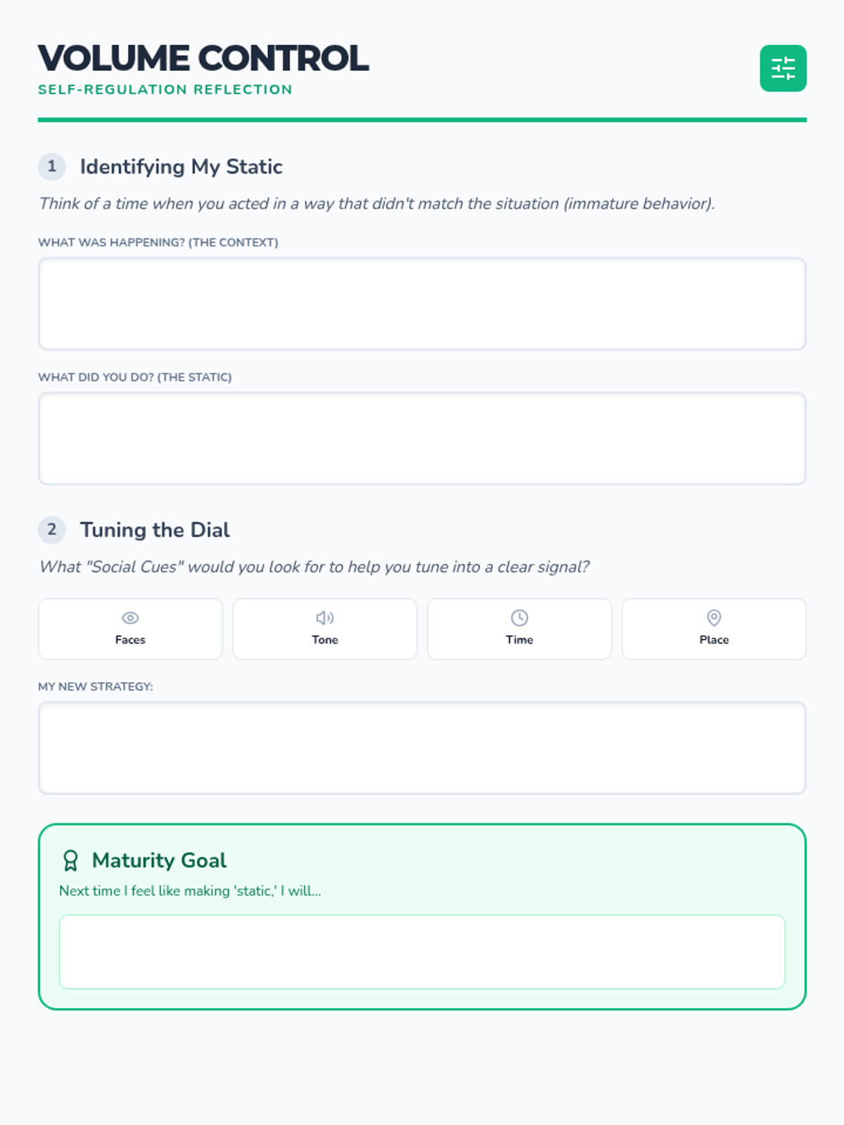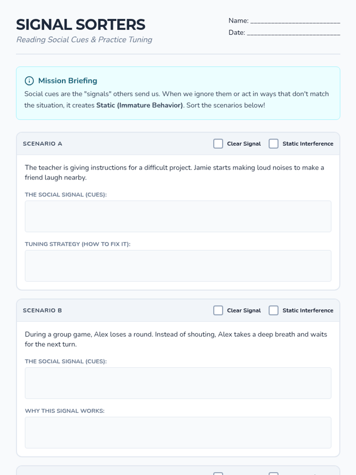 A student worksheet where they identify mature and immature behaviors in various scenarios, practice reading social cues, and suggest self-regulation strategies.