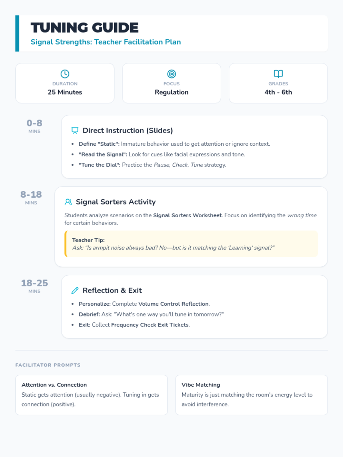 A facilitation guide for teachers to deliver the 25-minute lesson, including timing, key points, and discussion prompts.