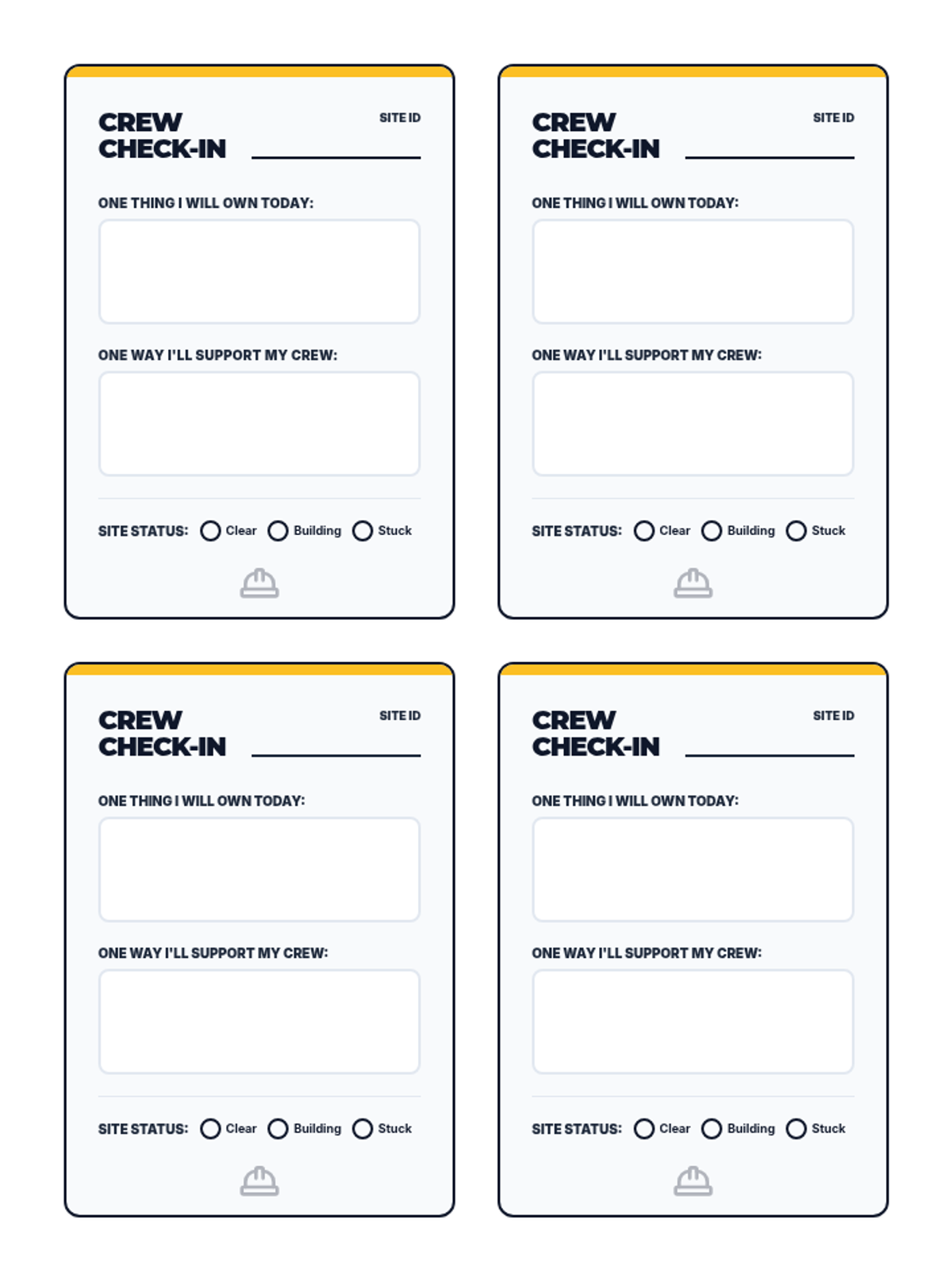 A set of four 'Crew Check-In' exit tickets on a single page, designed to be cut and distributed. Students reflect on one thing they will own and one way they will support their team. Enhanced spacing for student handwriting.