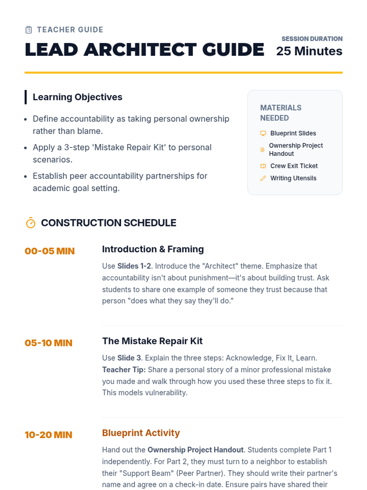 A comprehensive teacher guide for facilitating the 25-minute 'Accountability Architects' lesson. Includes learning objectives, a detailed pacing guide with slide references, and instructional tips. Improved layout for print readability.