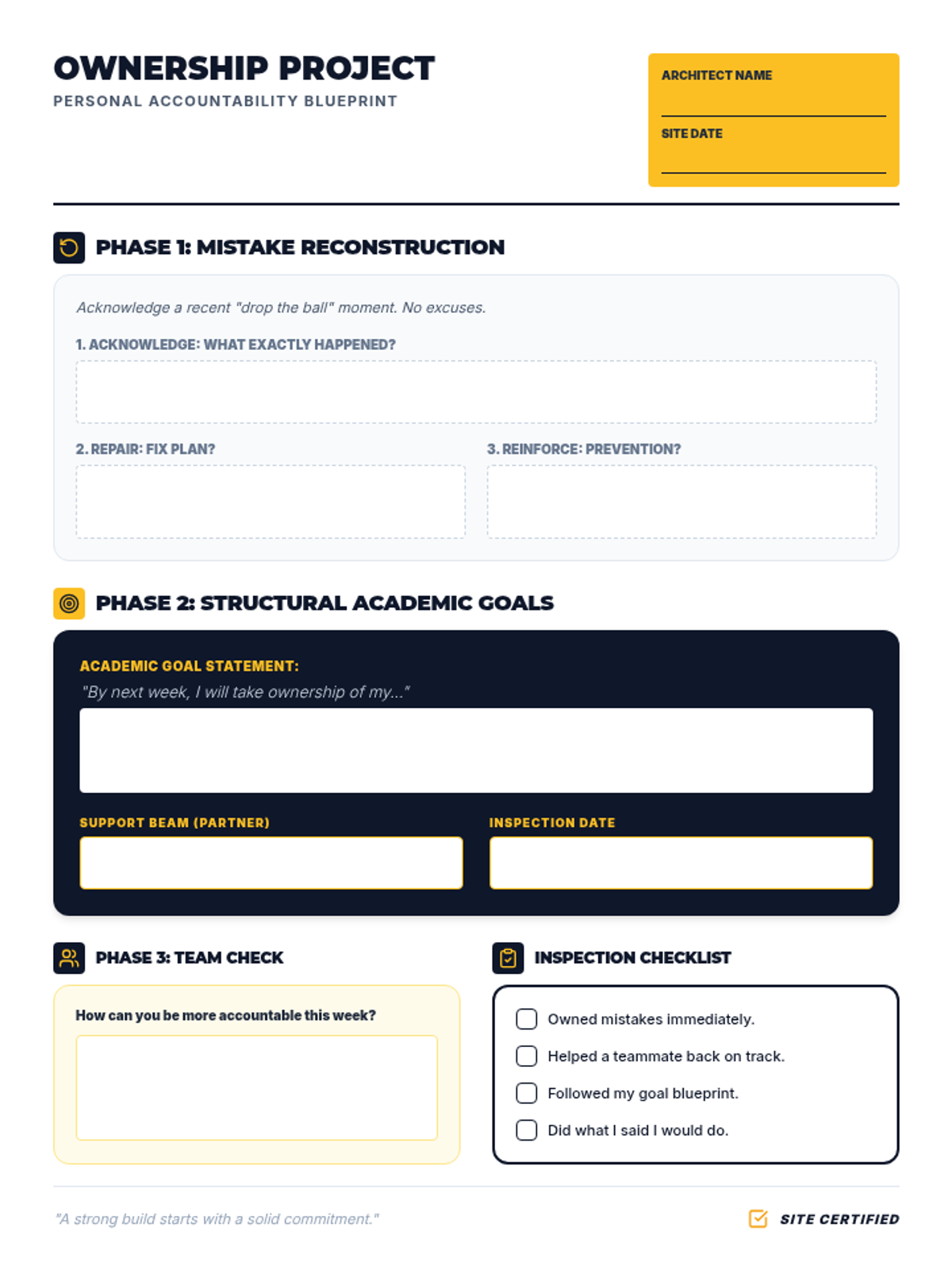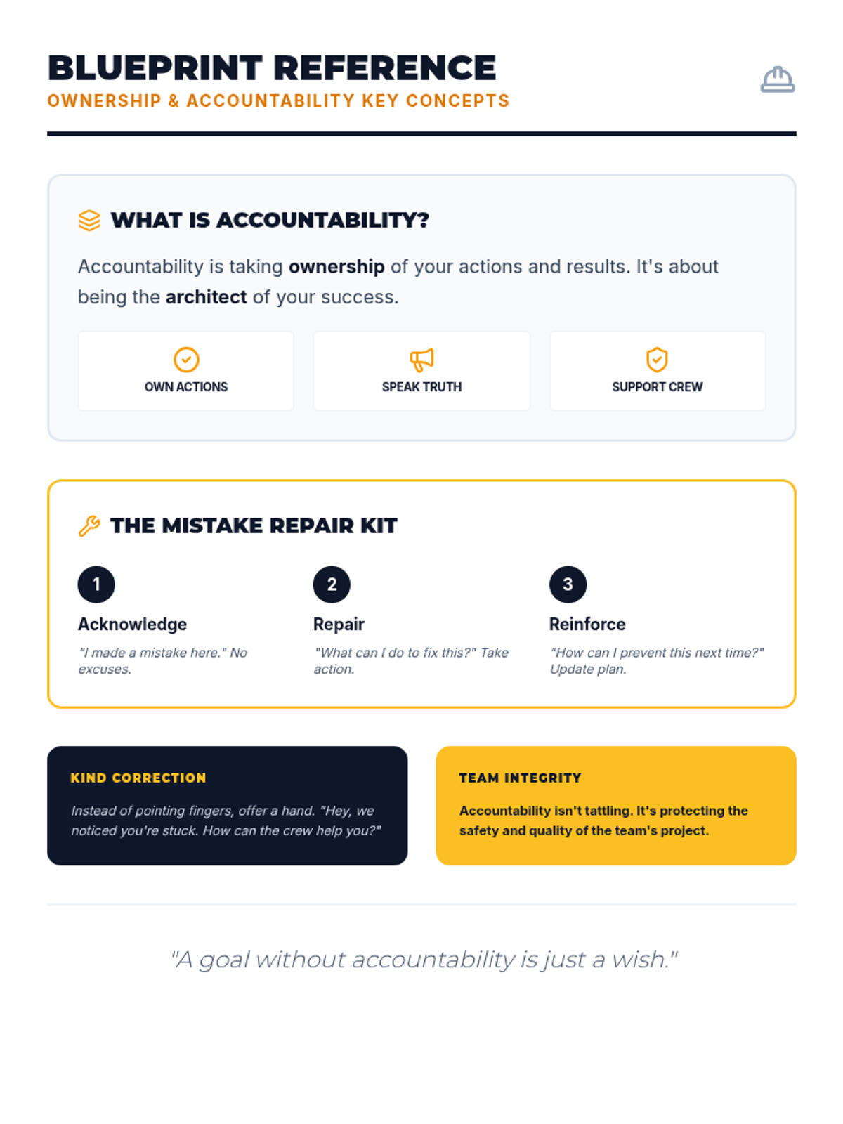 A printer-friendly one-page reference sheet for students summarizing the key concepts from the Accountability Architects lesson, including the Mistake Repair Kit and definition of accountability.