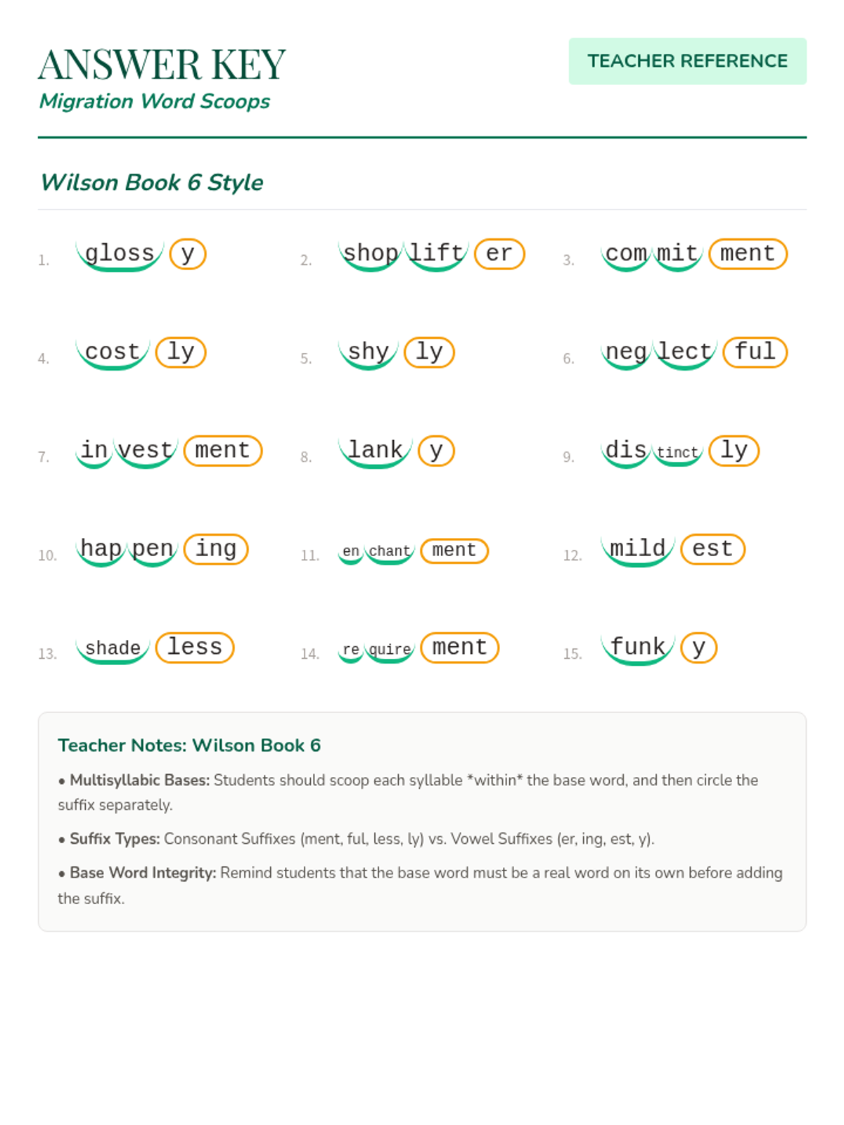 Teacher answer key for the Migration Word Scoops worksheet, showing correct base word/suffix divisions for all 15 words and teaching notes for Wilson Book 6. Improved 'scoop' visualization and layout.