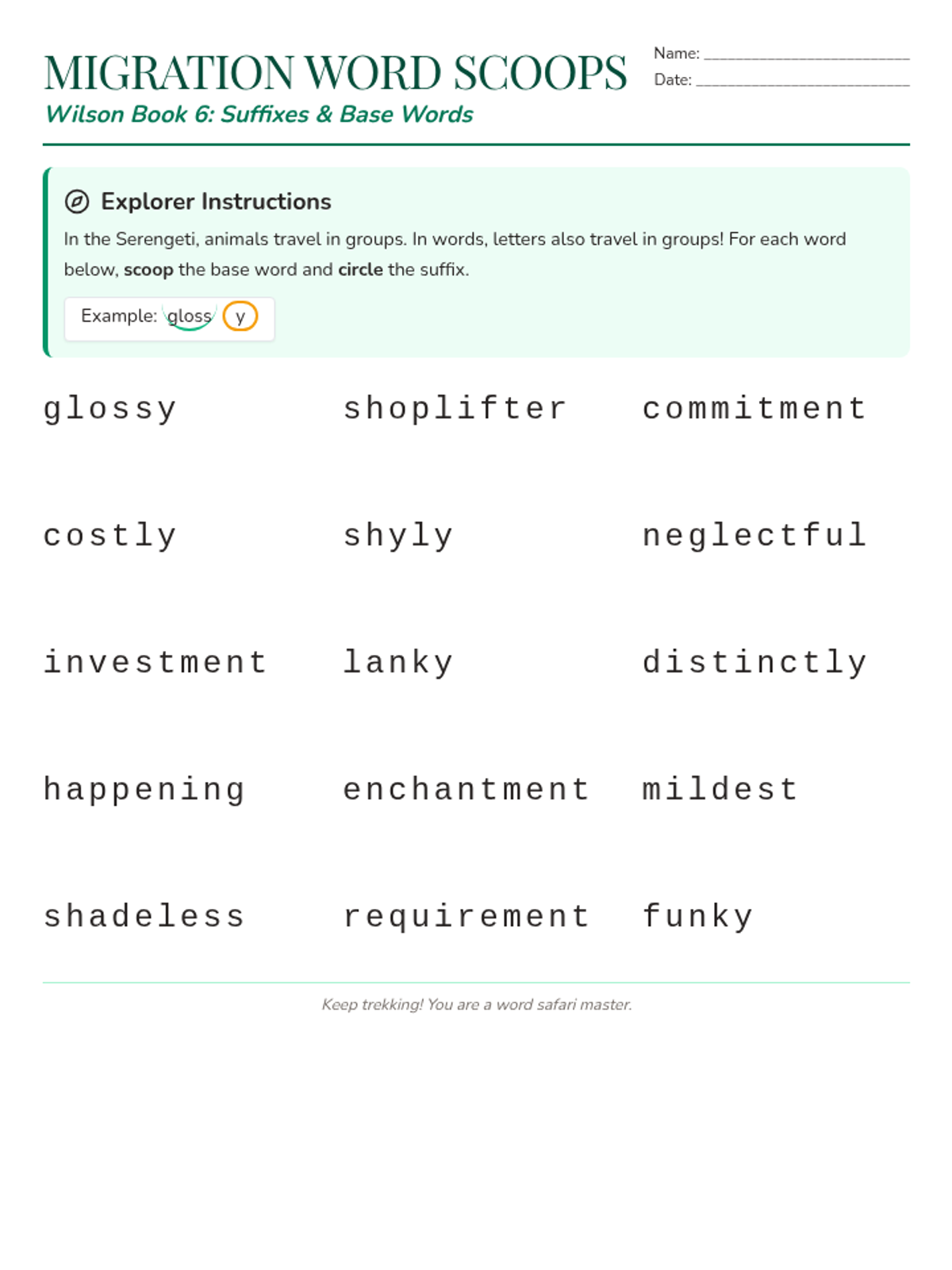 A Wilson-style word scooping worksheet where students identify base words and suffixes for 15 vocabulary words. Consolidated to one page with optimized spacing for student markings.