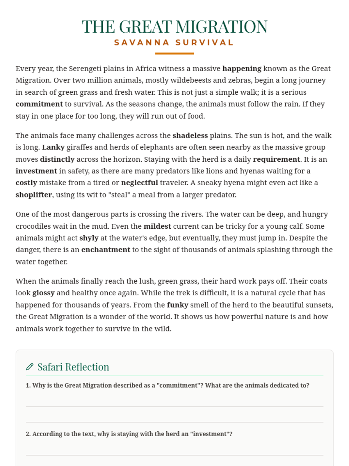A 4-paragraph reading passage about the Great Migration in the Serengeti, incorporating all 15 vocabulary words including 'shoplifter'. Includes student work areas for reflection and optimized layout for printing.