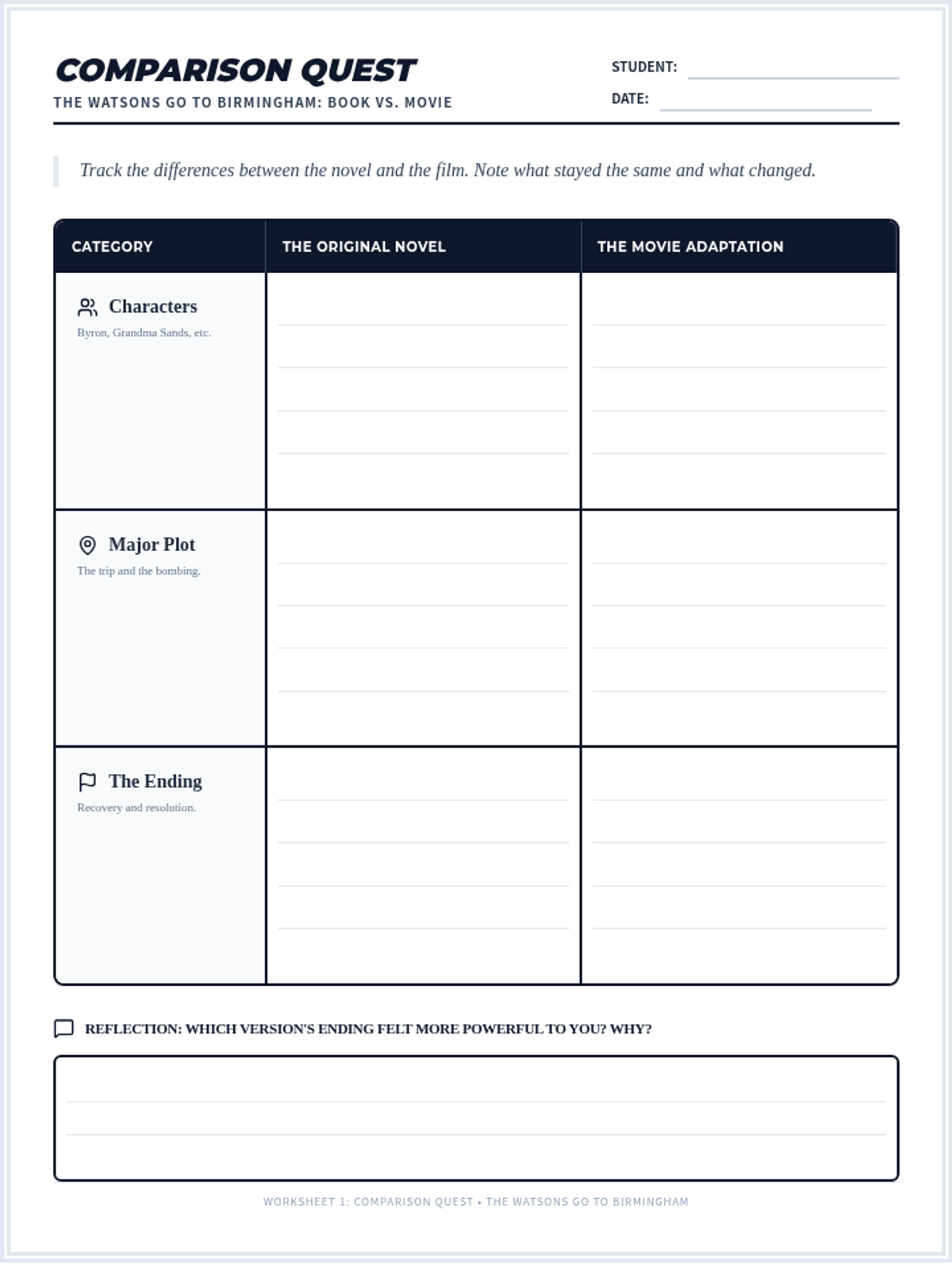 A student worksheet featuring a category-based comparison table to analyze differences between 'The Watsons Go to Birmingham' novel and its movie adaptation.