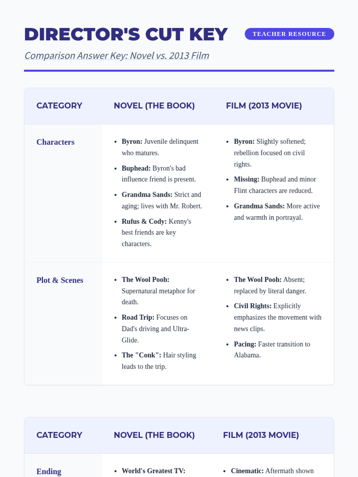 A comprehensive answer key for teachers comparing the book and movie versions of 'The Watsons Go to Birmingham', featuring character changes, plot adjustments, and ending variations.