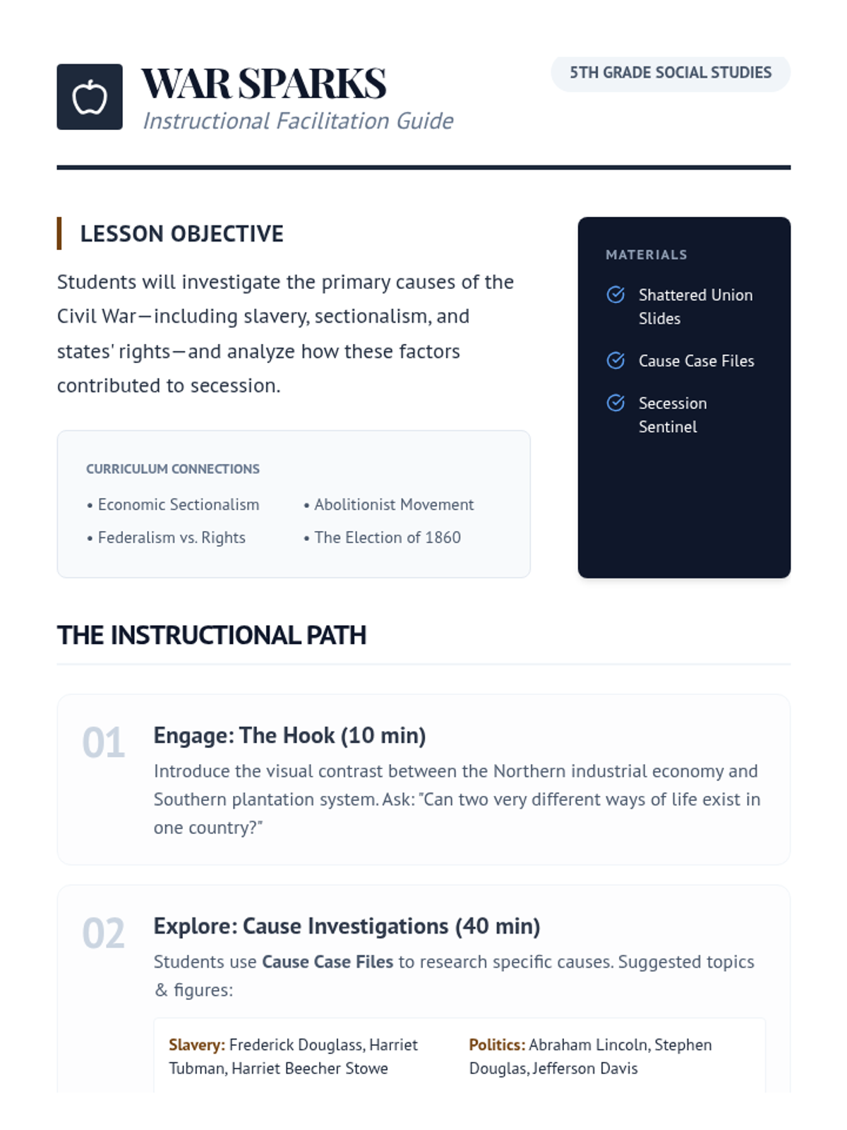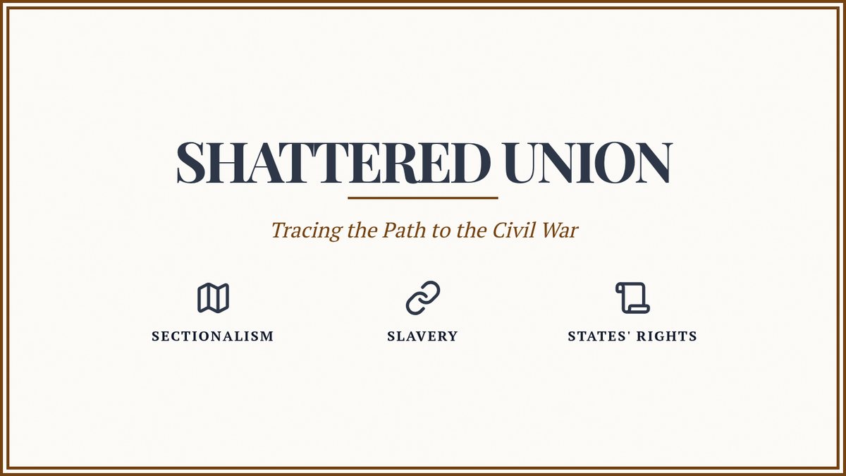 A visually engaging slide deck covering the primary causes of the American Civil War, including slavery, sectionalism, states' rights, and the 1860 election. Designed with a historical archive aesthetic to immerse 5th-grade students in the era.