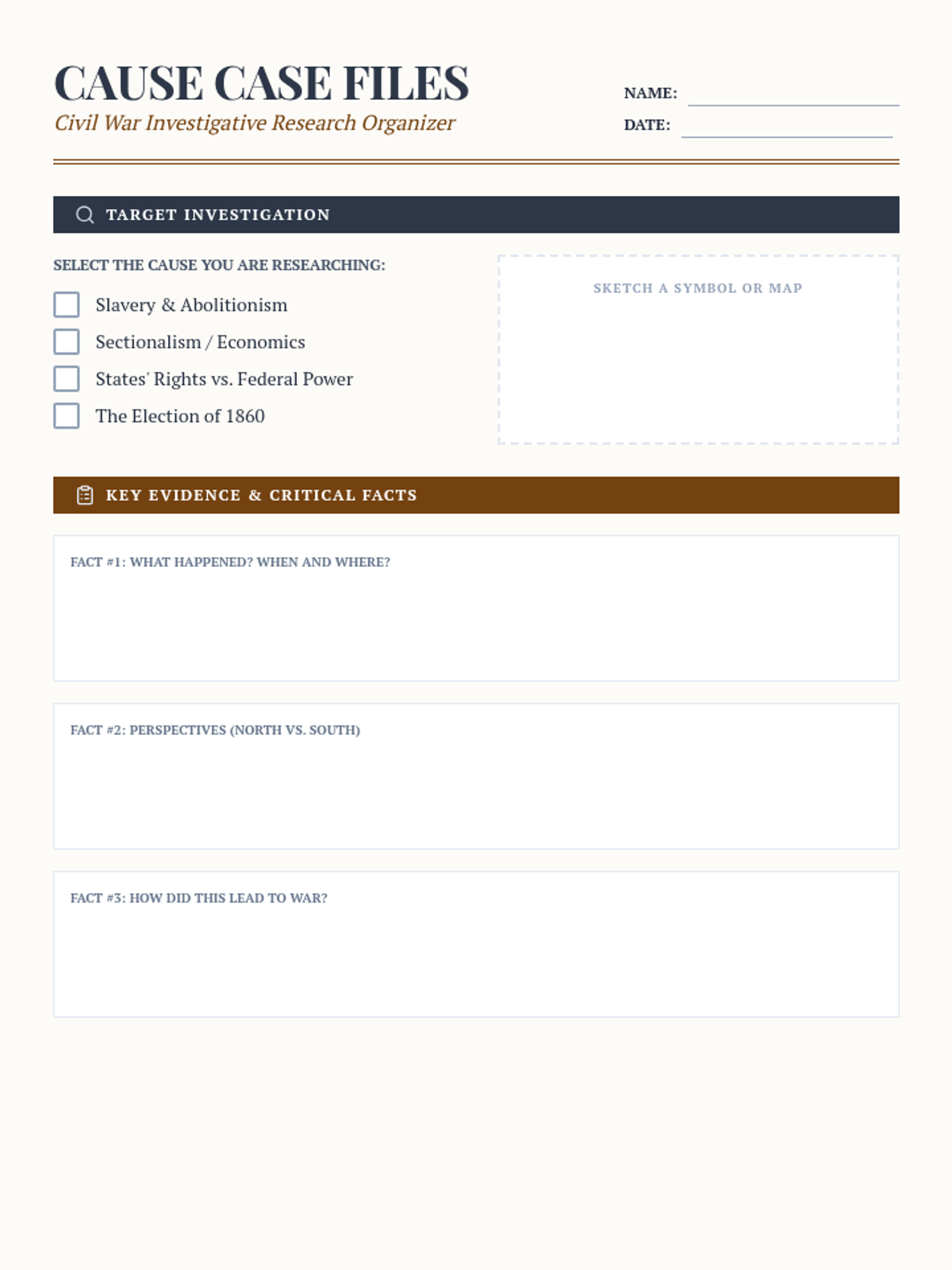 A structured research organizer for 5th-grade students to collect facts, identifying symbols, and historical figures related to a specific cause of the Civil War. Features a "top secret" archive aesthetic.