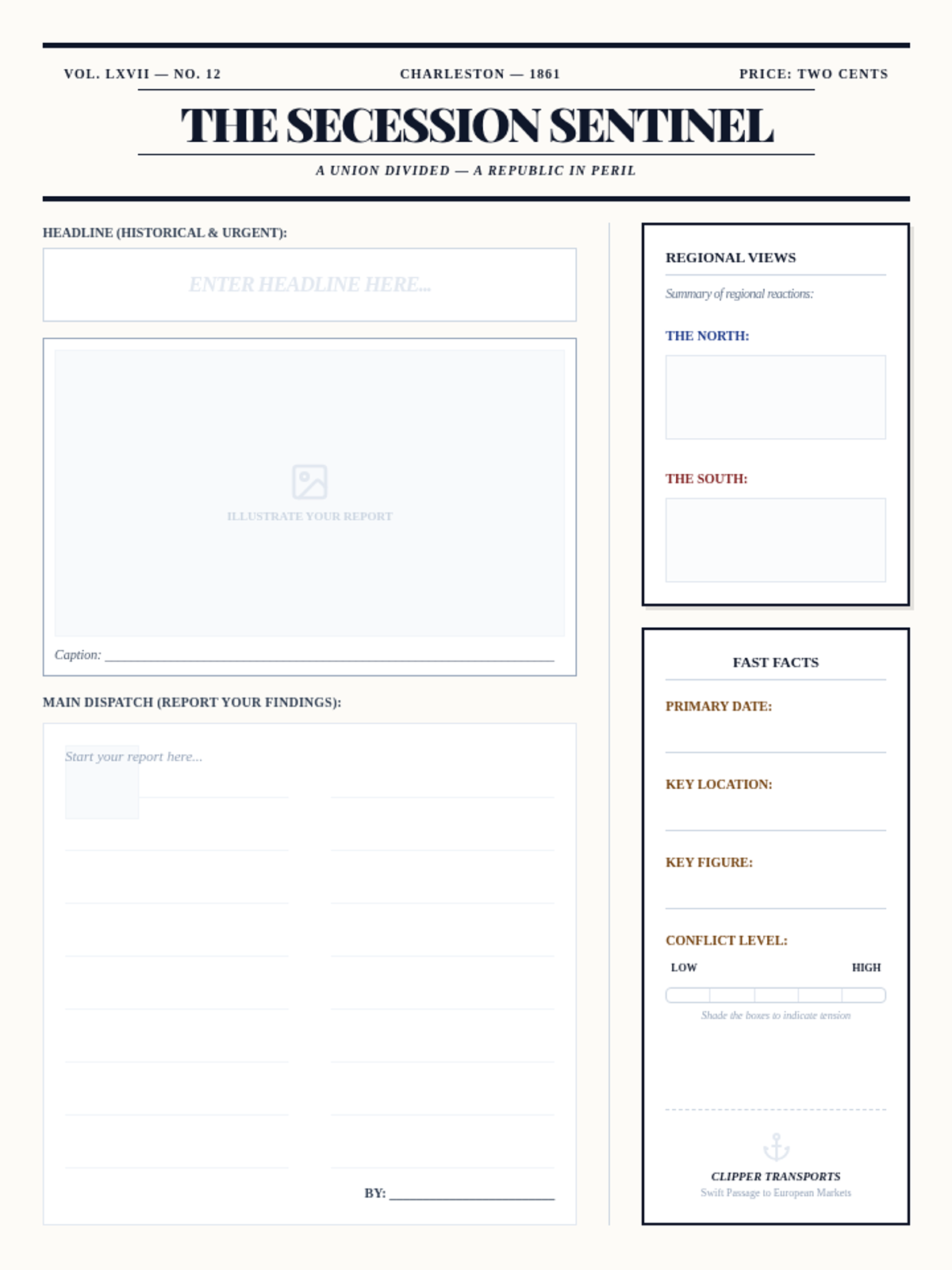 A creative reporting template designed as a 19th-century newspaper front page. Students apply their research to write headlines, articles, and analyze sectional sentiments regarding a cause of the Civil War.