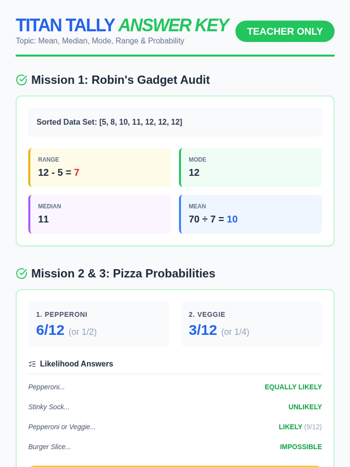 A teacher-facing answer key for the Titan Tally Worksheet, providing clear solutions and explanations for all statistics problems with improved formatting.