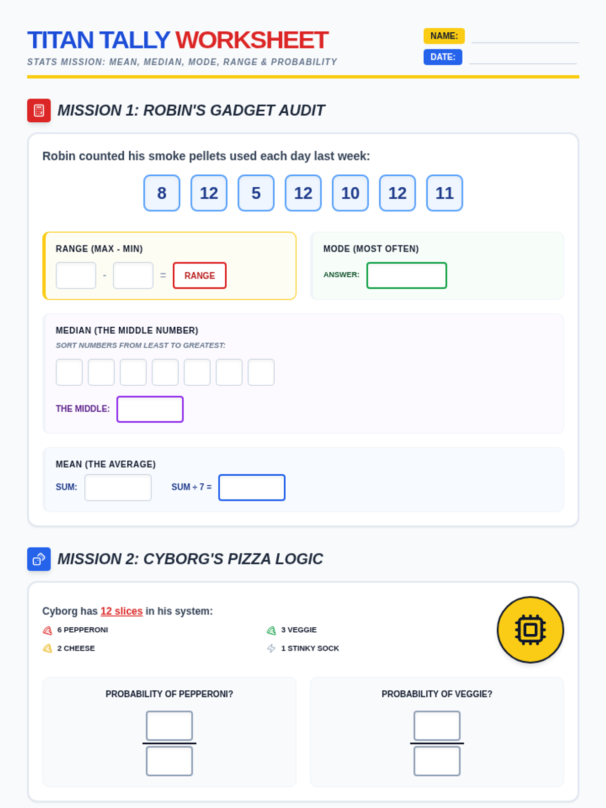 A step-by-step guided practice worksheet for statistics including mean, median, mode, range, and probability calculations themed around the Teen Titans. Adjusted for better page breaks and work space.