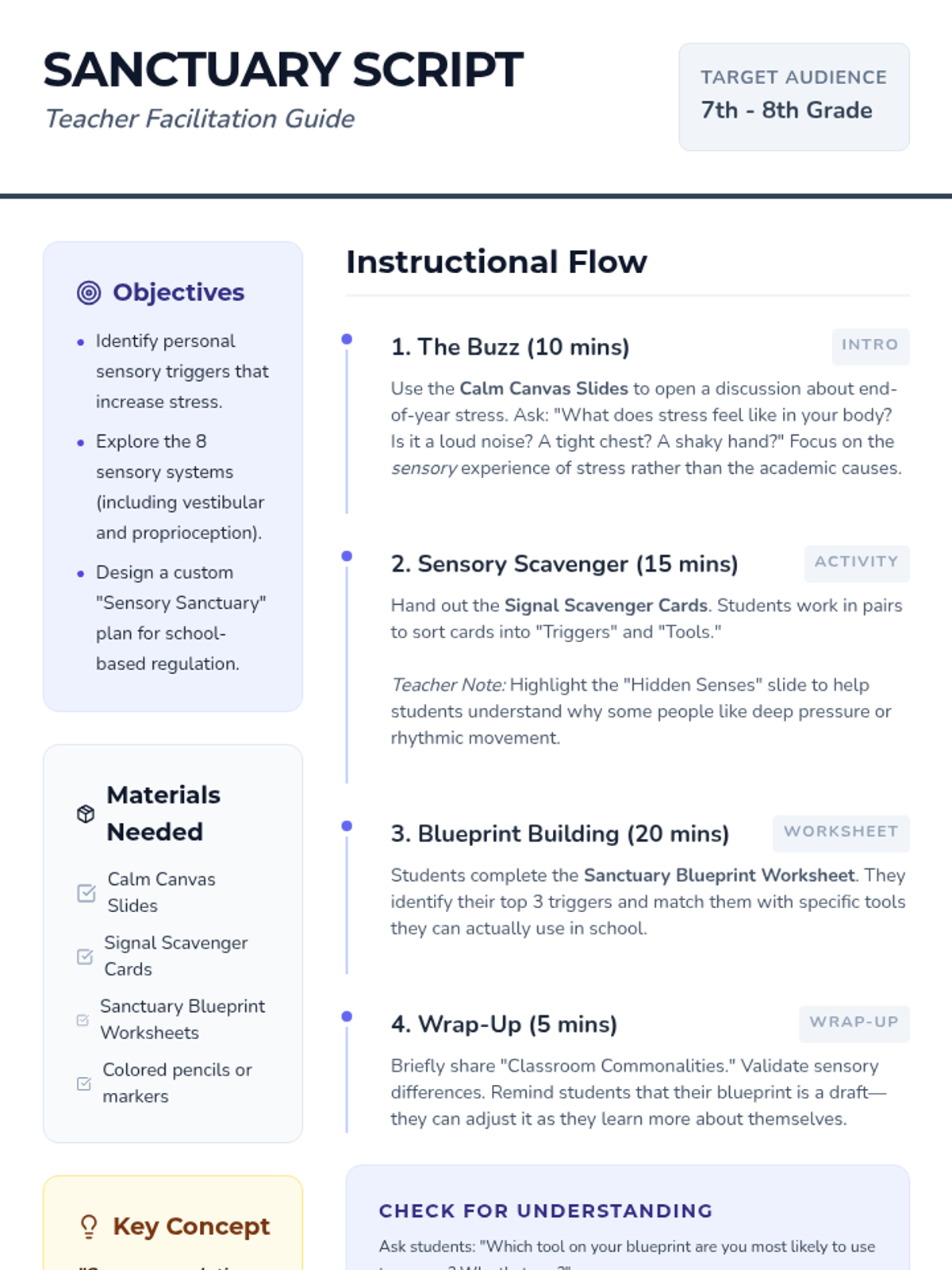 A comprehensive teacher guide for facilitating the Sensory Sanctuary lesson, including pacing, instructional flow, and differentiation strategies for middle school students.