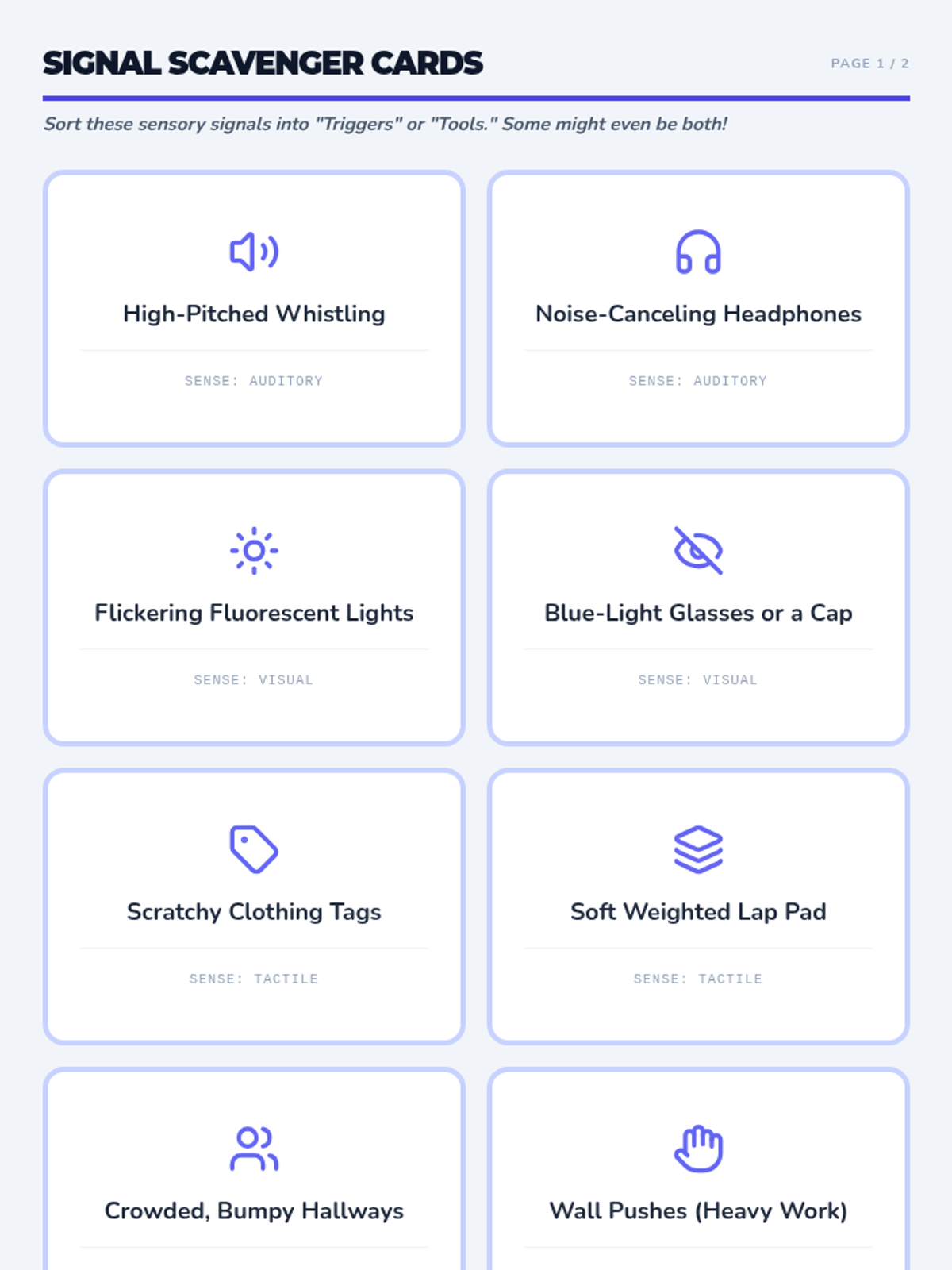 A hands-on card sorting activity where students categorize various sensory experiences as either 'Triggers' that cause stress or 'Tools' that help with self-regulation. Uniform styling ensures critical thinking during sorting.