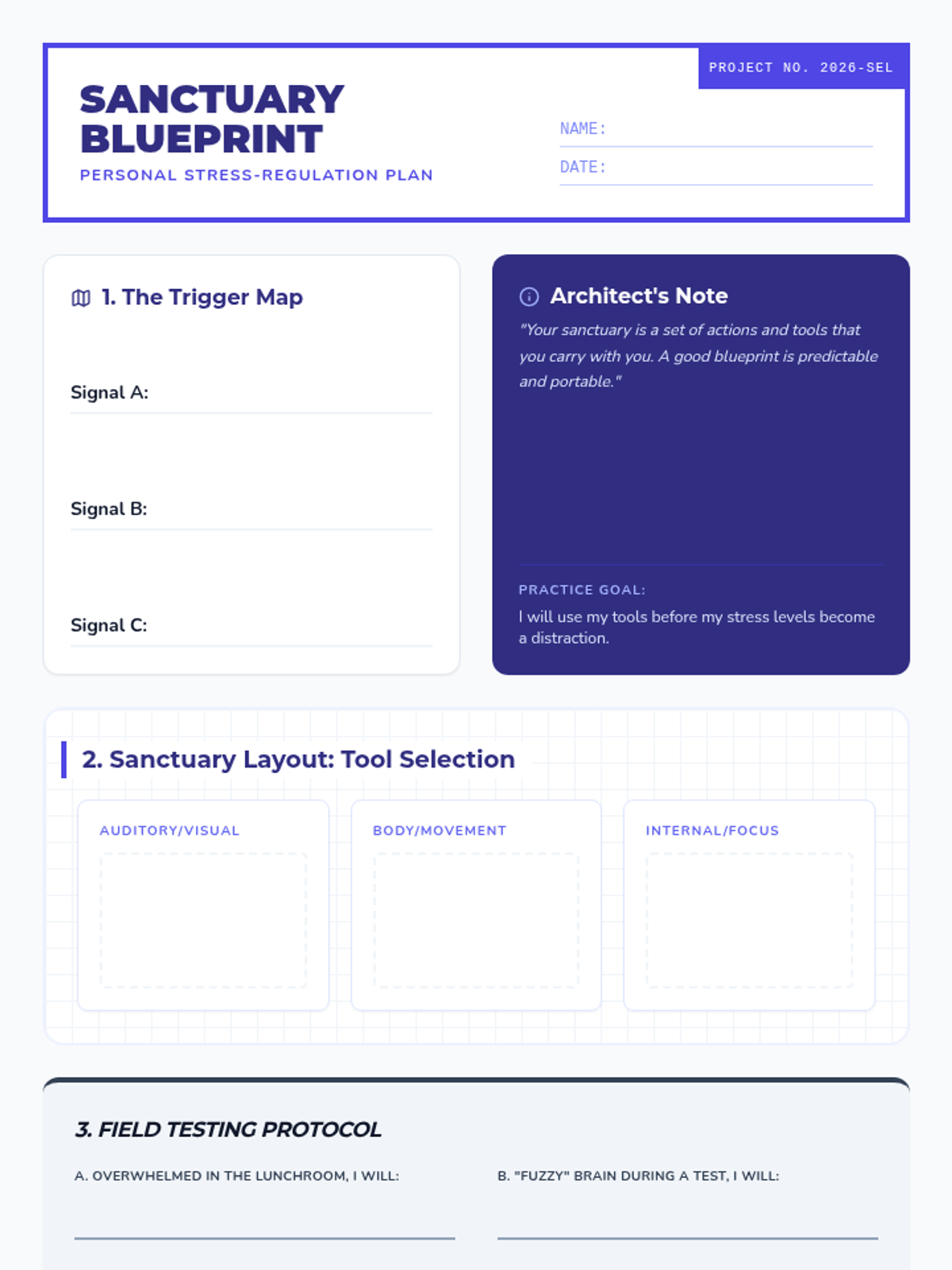 A structured worksheet for students to map out their personalized sensory regulation plan, including triggers, tool selection, and specific implementation scenarios for the school environment.