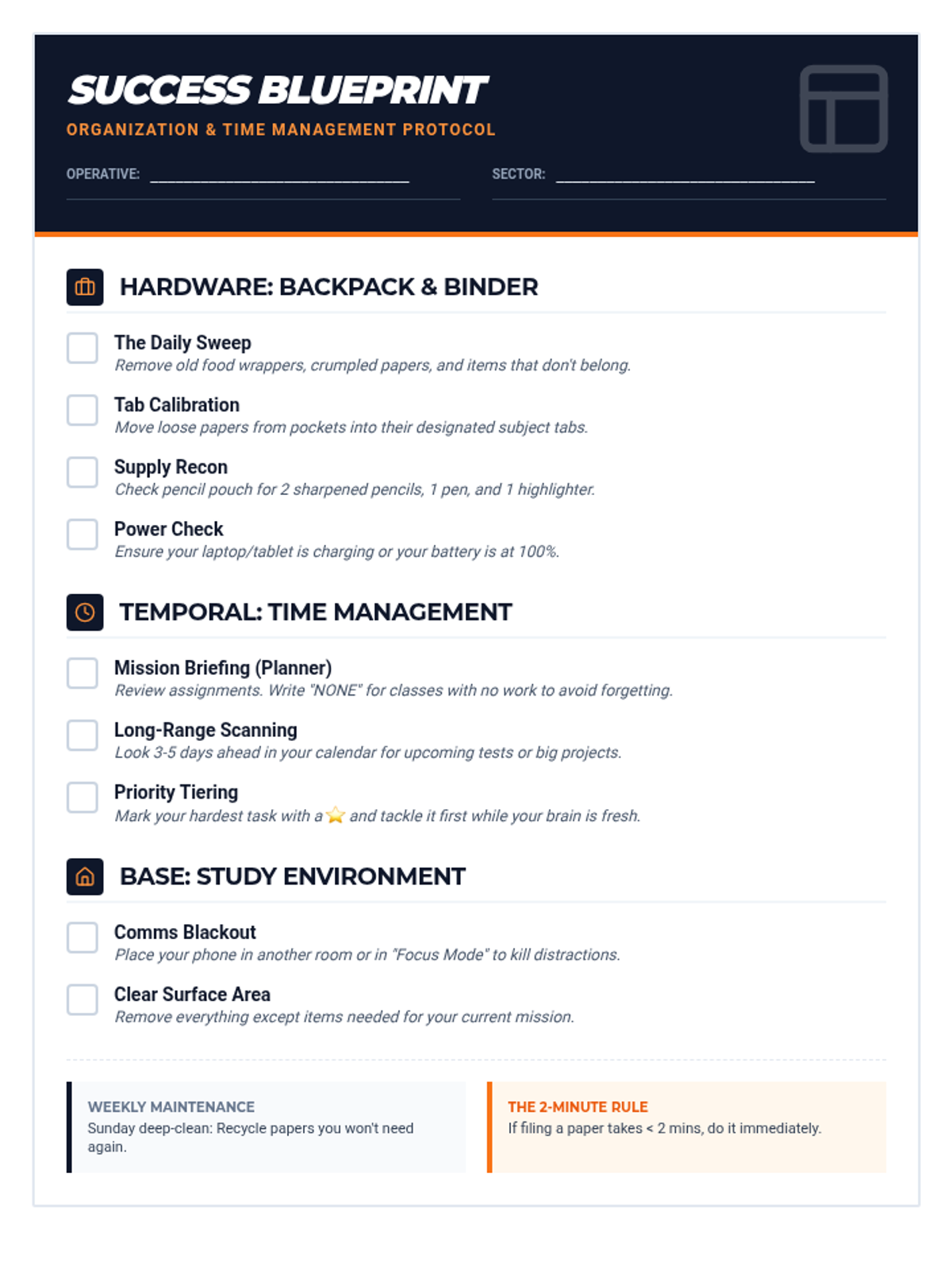 A blueprint-themed study skills checklist for middle schoolers, designed as a binder or backpack insert. It focuses on hardware organization, time management strategies, and study environment optimization with actionable tasks.