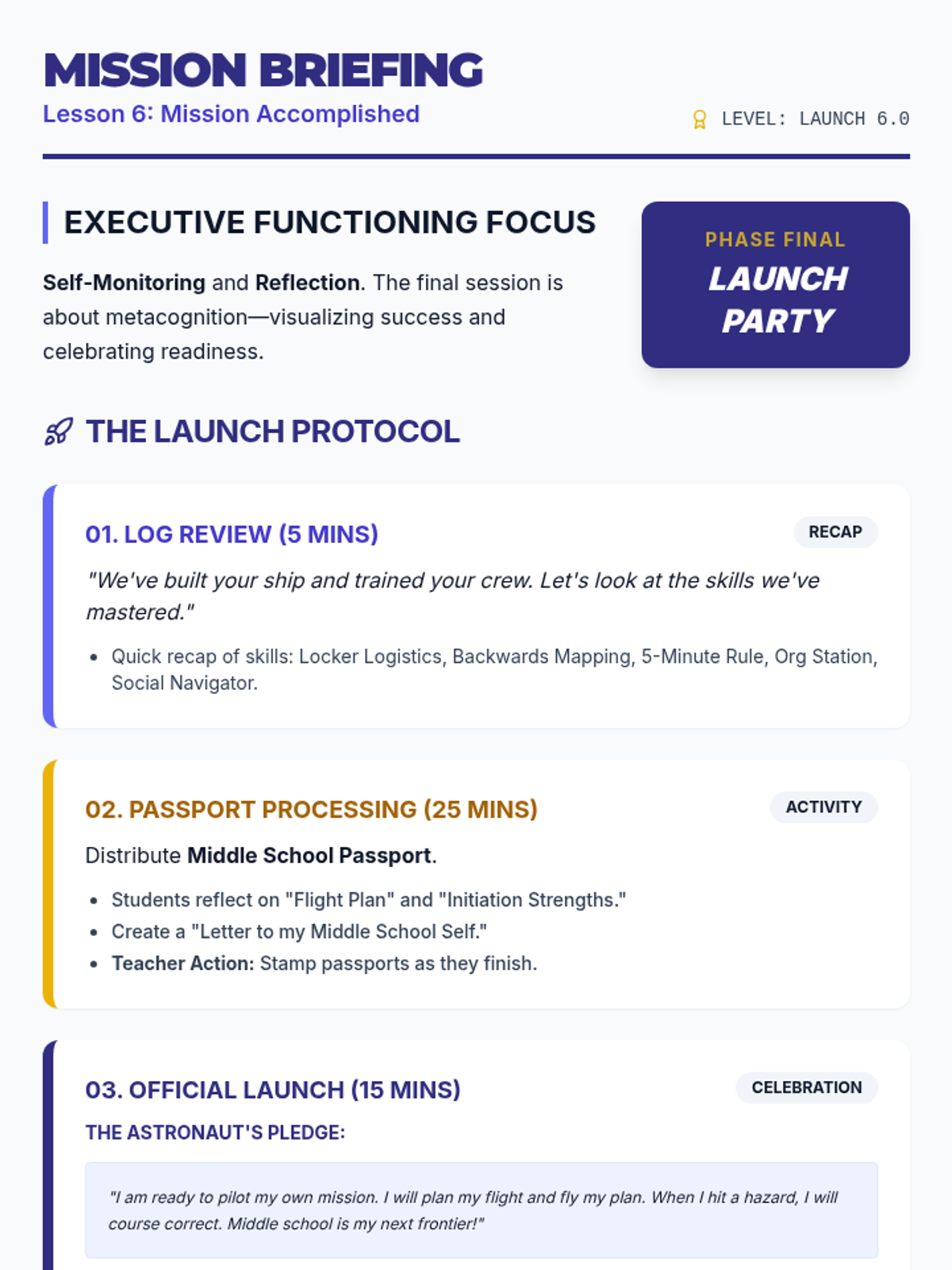 A facilitation guide for the final session of the Middle School Launchpad, focusing on reflection, self-monitoring, and a celebratory transition.