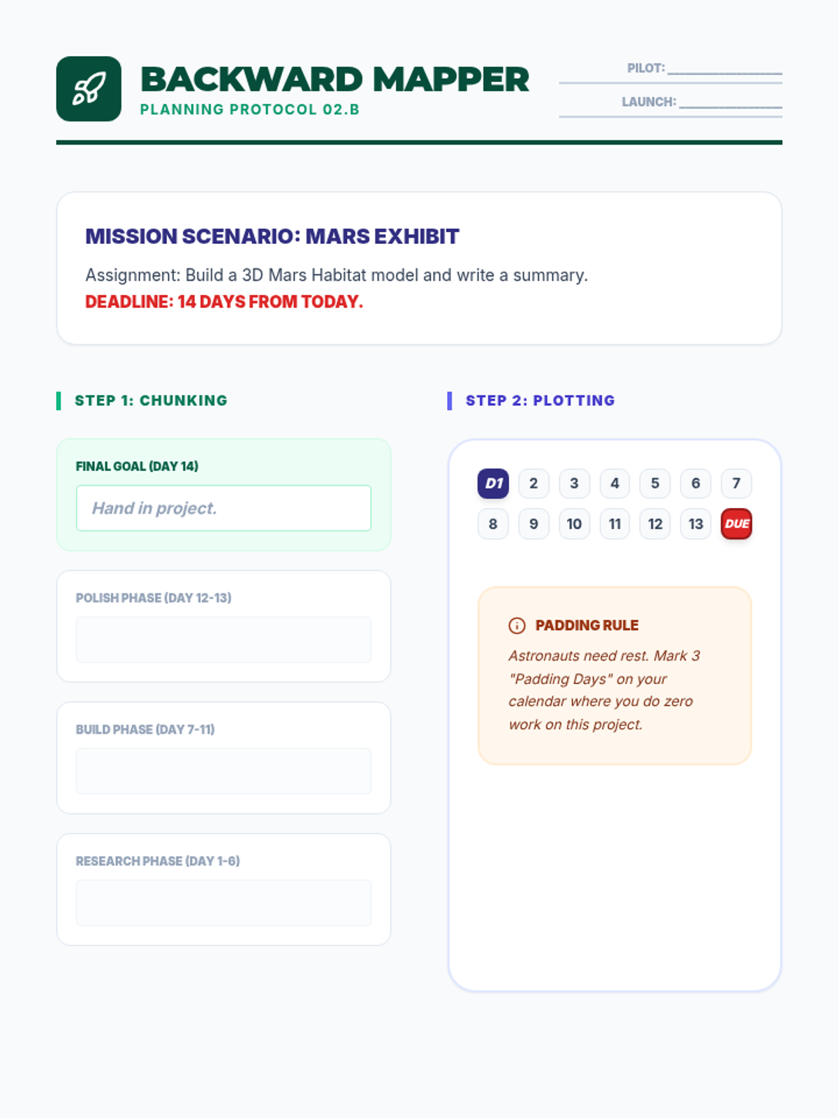 A worksheet designed to help students practice the 'backward mapping' technique by breaking down a hypothetical 14-day science project into manageable chunks.