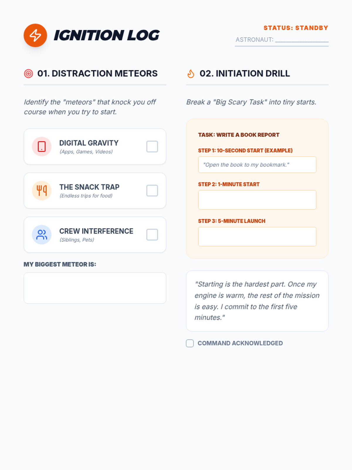 A worksheet for students to identify their personal distractions and practice breaking large tasks into 'micro-initiations' to build momentum.