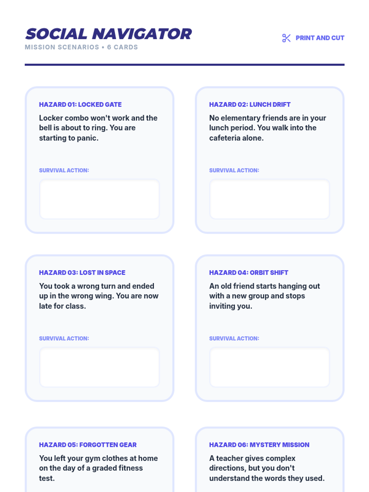 A set of printable scenario cards for students to practice problem-solving common middle school transition challenges in small groups.