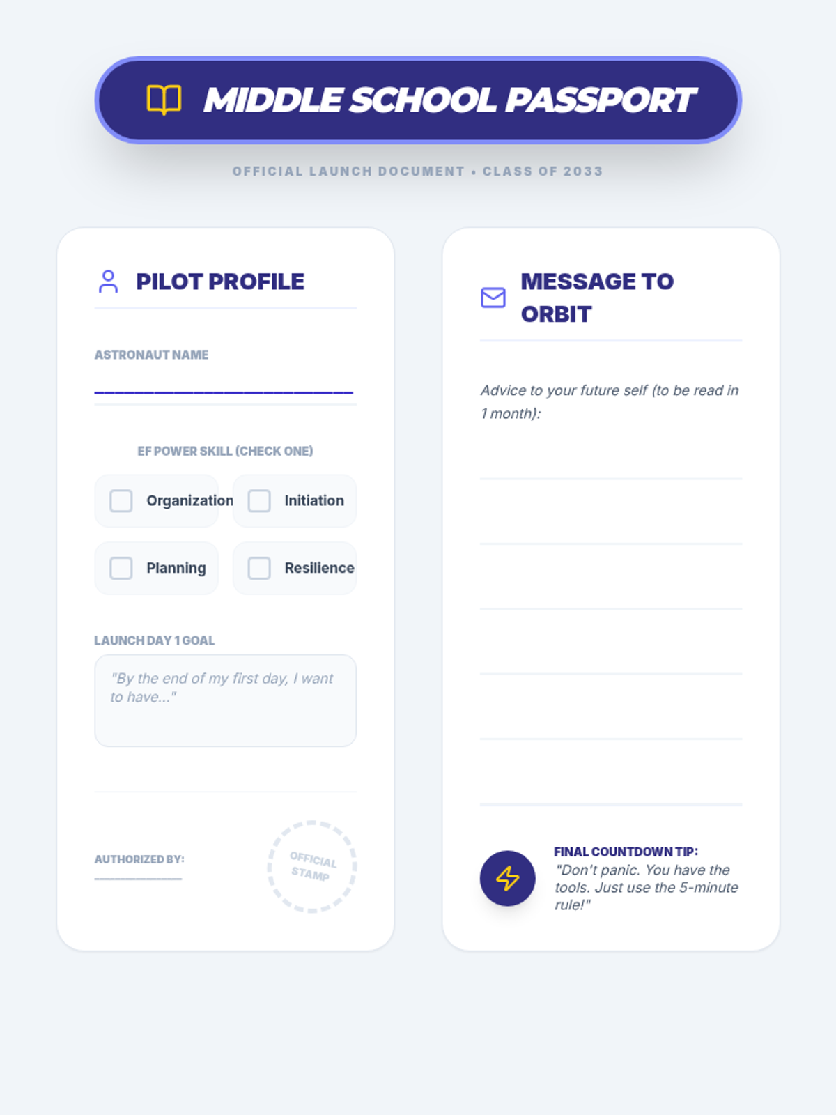 A student reflection document designed as a 'passport' to middle school, featuring self-assessment of executive functioning strengths and a letter to their future self.