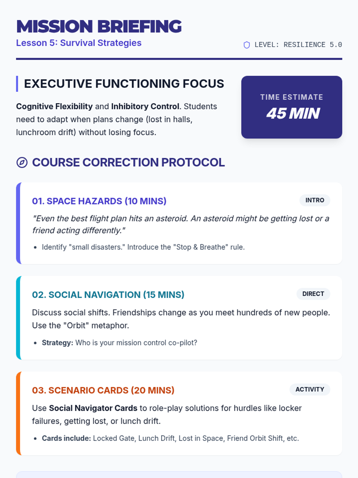 A teacher guide for Lesson 5 of the Middle School Launchpad, focusing on social dynamics, social-emotional problem solving, and cognitive flexibility.