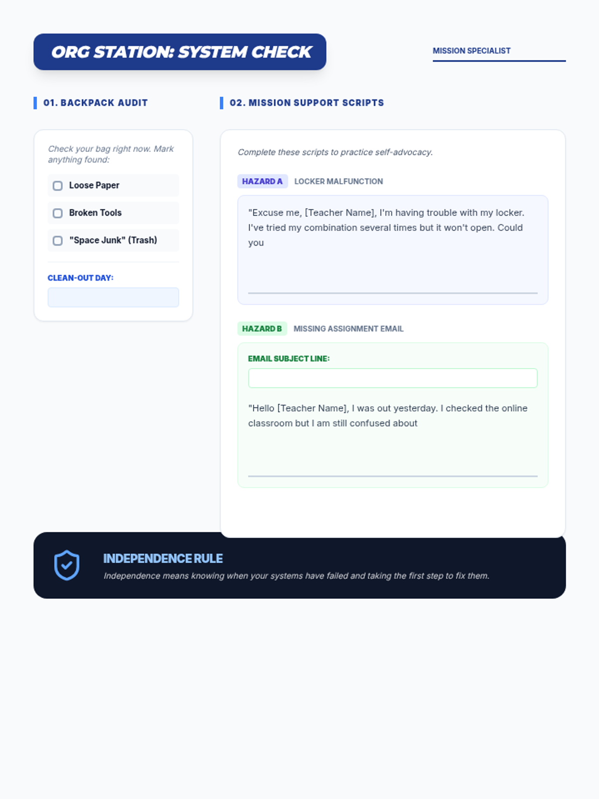 A worksheet for students to audit their physical organization and practice scripting professional requests for help (self-advocacy).