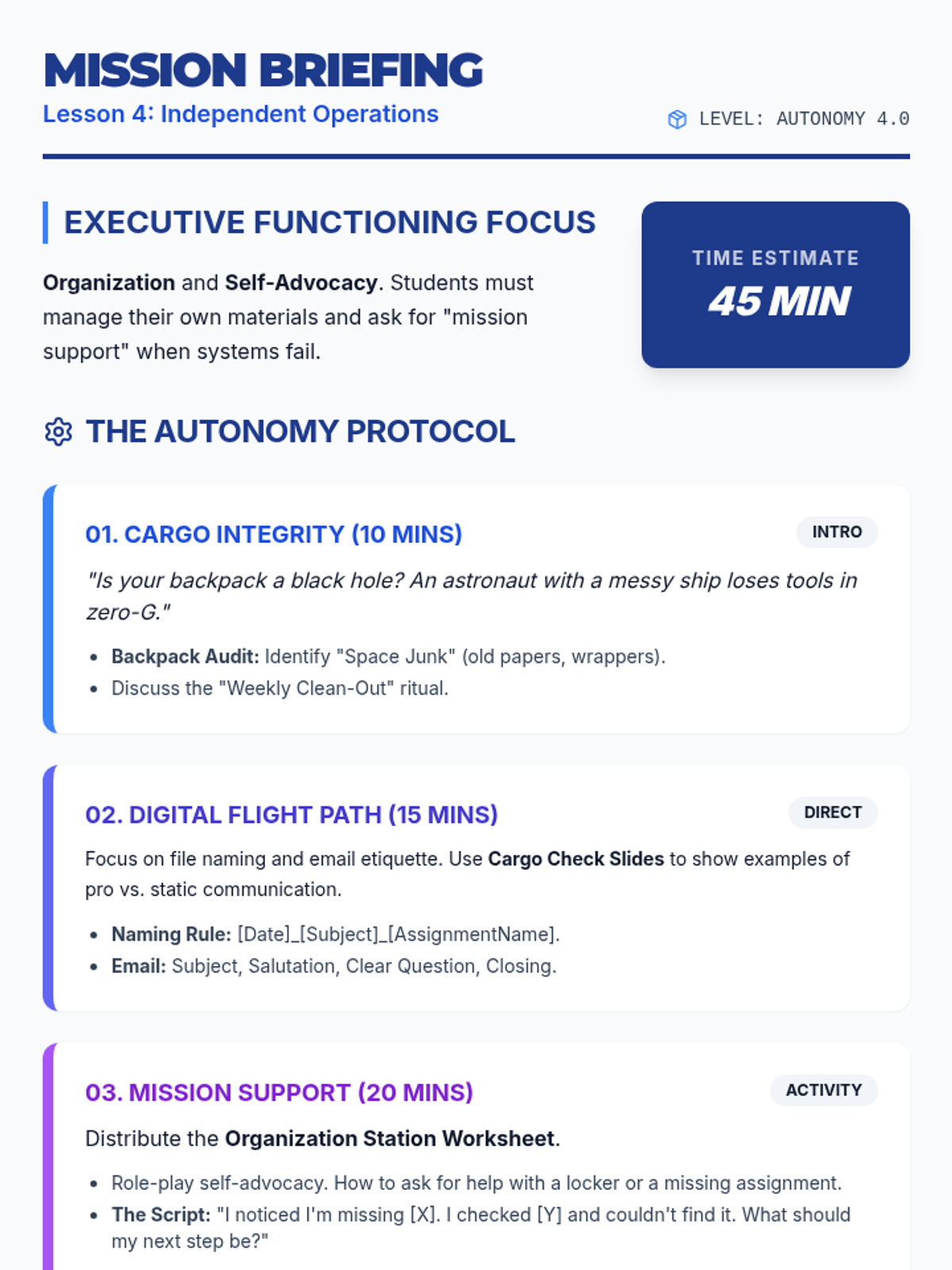 A teacher guide for Lesson 4 of the Middle School Launchpad, focusing on physical/digital organization and the transition to independent self-advocacy.
