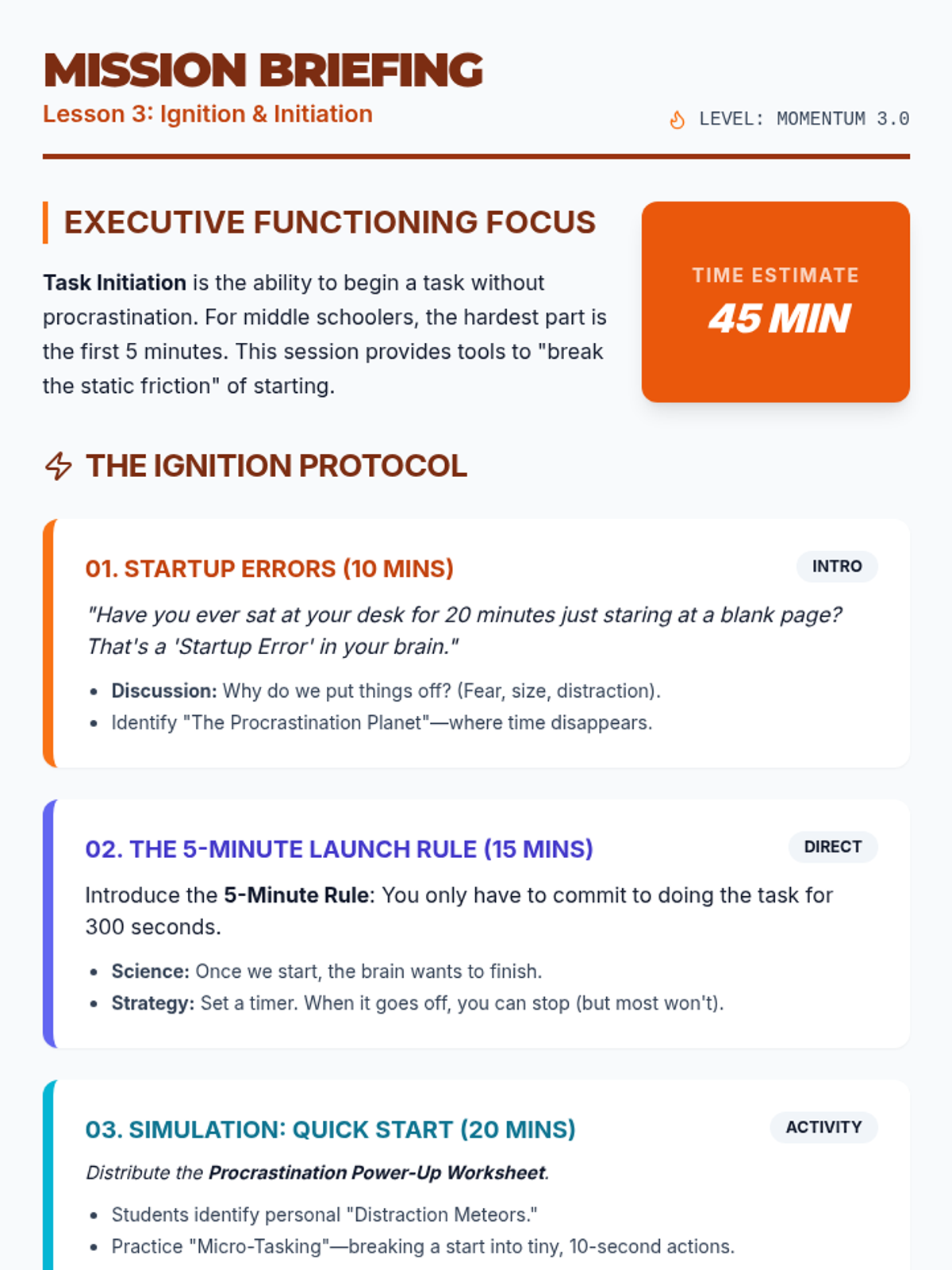 A teacher guide for Lesson 3 of the Middle School Launchpad, focusing on task initiation techniques like the 5-minute rule and overcoming procrastination.