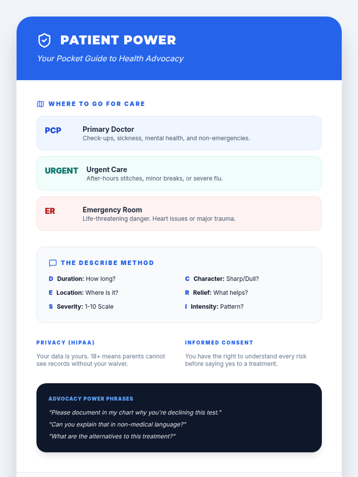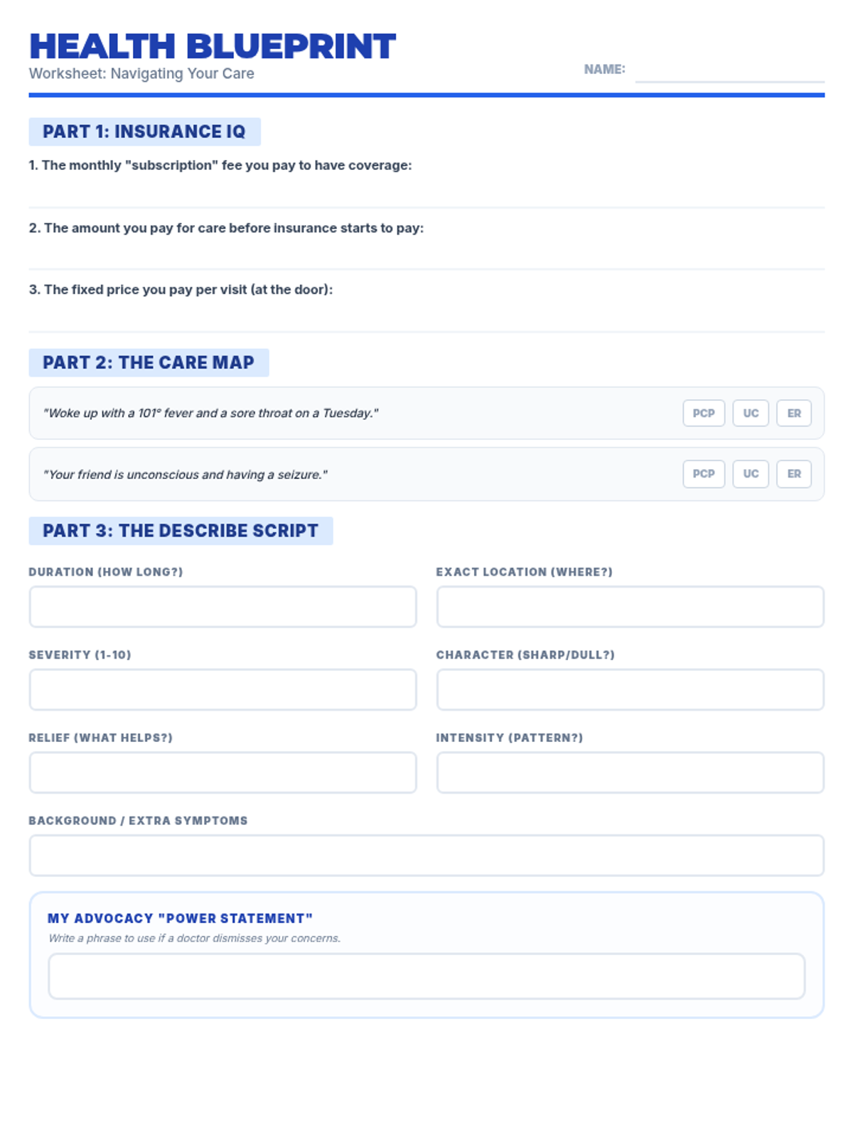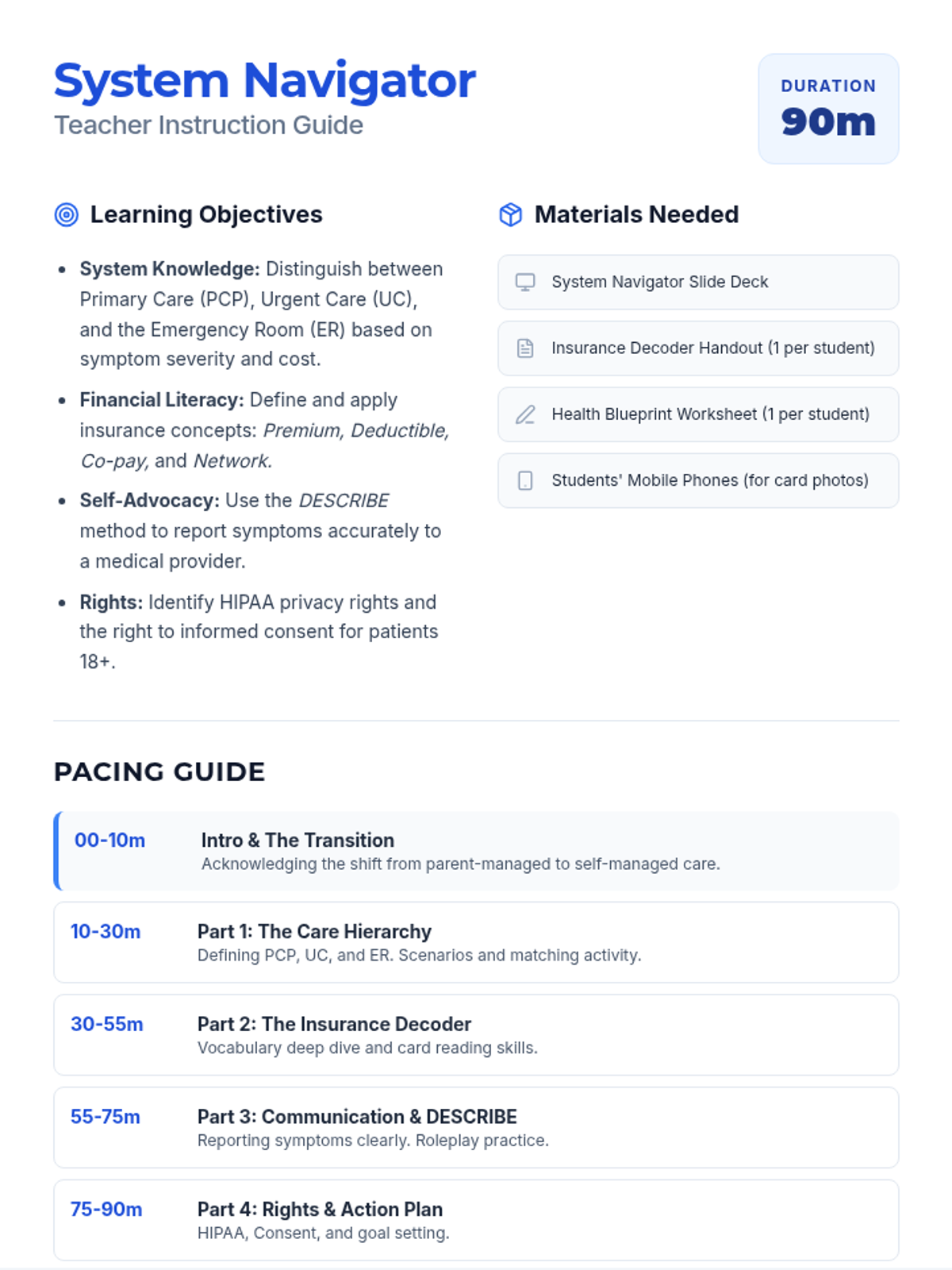 A comprehensive 4-page instructor guide for facilitators leading a 90-minute session on health systems and self-advocacy. It now includes expanded instruction on health insurance terminology, including premiums, deductibles, and network navigation.