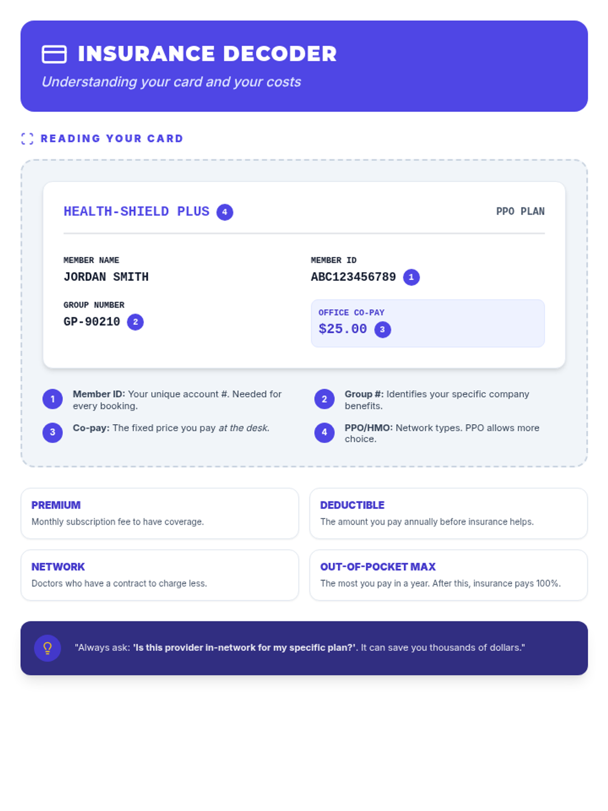 A student reference handout that demystifies health insurance terminology. It includes a visual breakdown of a health insurance card and clear, plain-language definitions for complex terms like premium, deductible, and out-of-pocket maximum. Optimized for single-page use. Mnemonic labels updated for consistency.