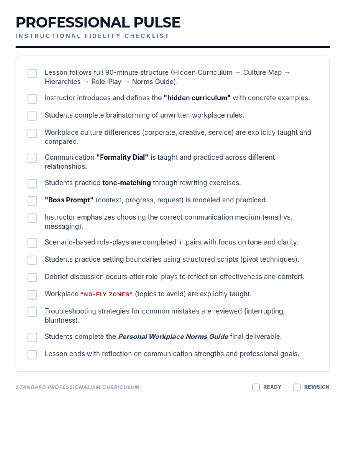 A 5-page student workbook for Session 3, focused on identifying unwritten rules, practicing tone-matching, and setting professional boundaries. Features structured exercises for drafting emails, scripts, and a personalized norms guide.