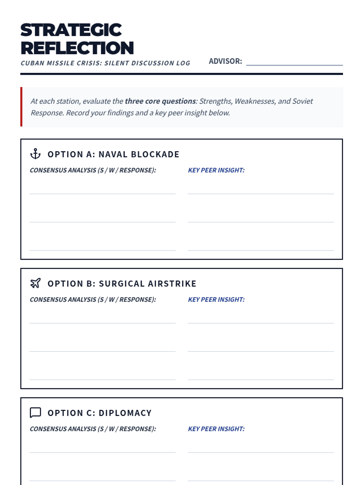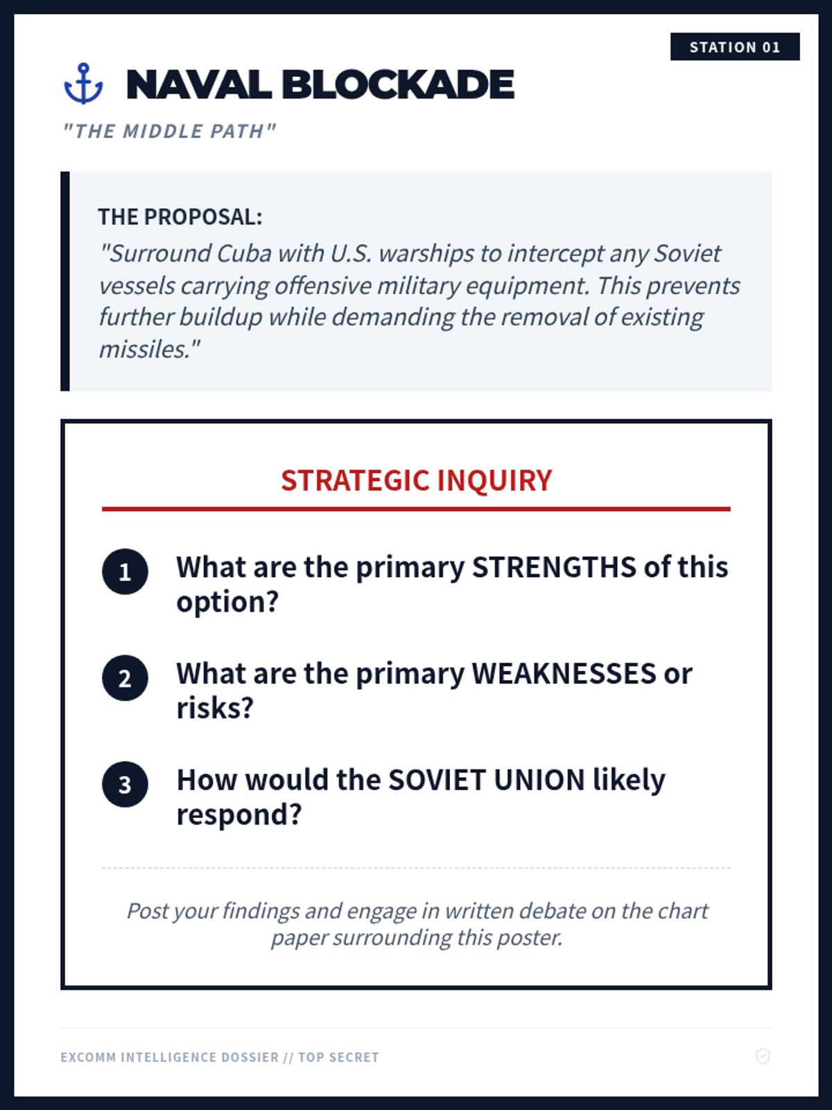 Four high-impact printable posters to be used as central prompts for a silent discussion activity. Each poster outlines a primary policy option JFK faced during the Cuban Missile Crisis, serving as the starting point for students to add their analysis and peer responses on larger chart paper.