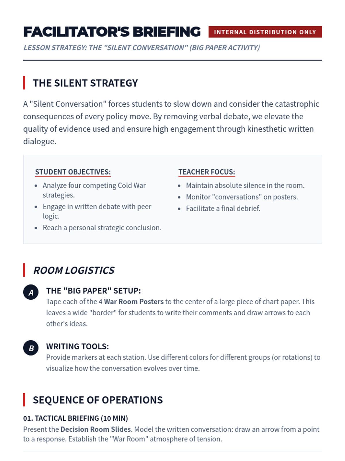 A comprehensive facilitator's guide updated to support a 'Silent Conversation' (Big Paper) activity. It provides instructions for setting up station posters, managing a silent classroom through 'Security Violations,' and guiding students in written debate.