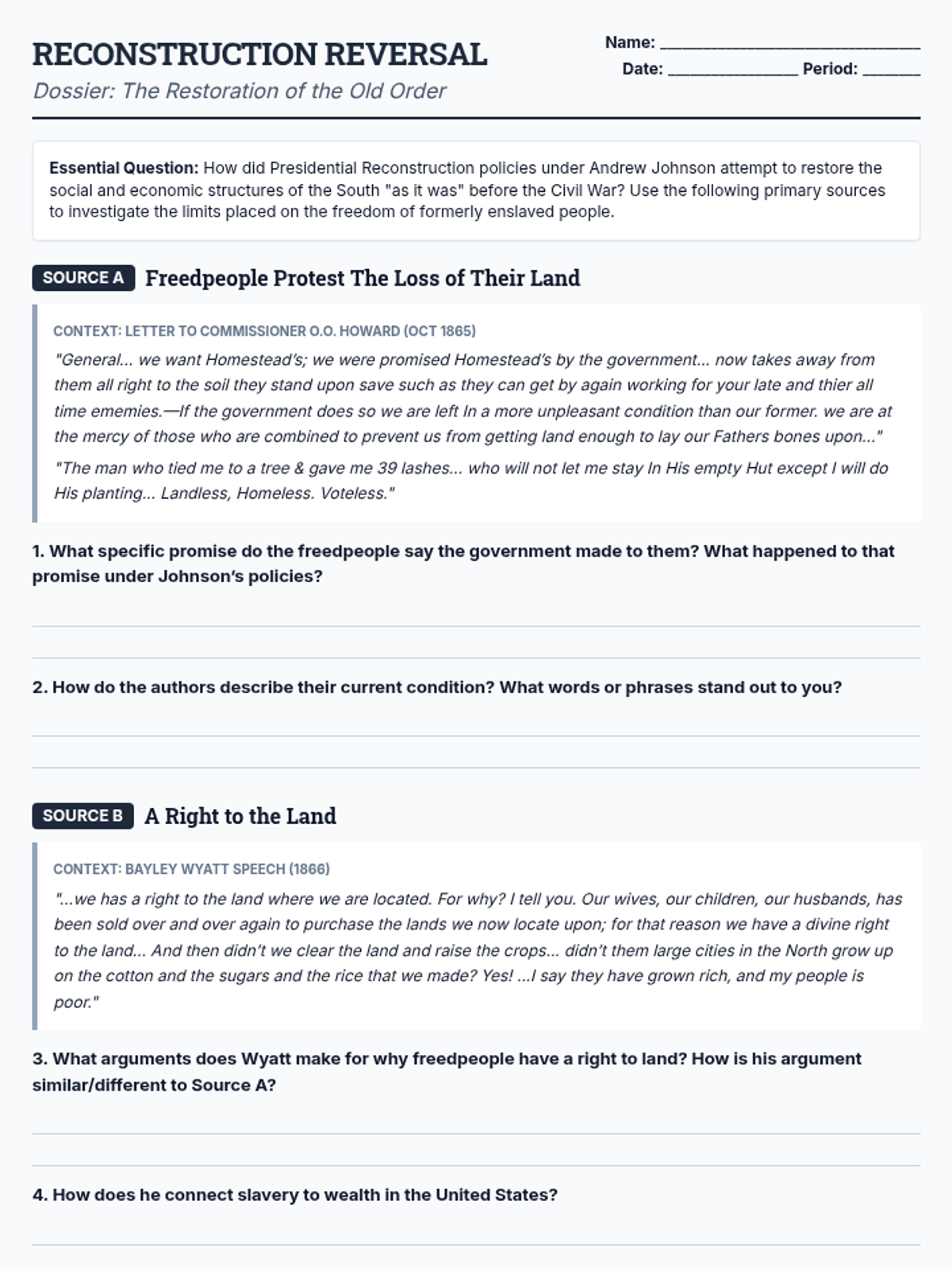 A primary source analysis worksheet for tenth-grade history students exploring how Presidential Reconstruction policies limited the freedom of formerly enslaved people through land seizure, sharecropping, and Black Codes.