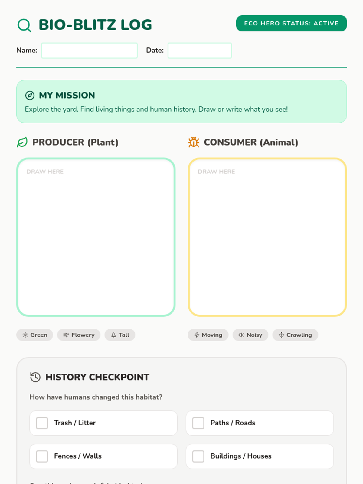 A hands-on field observation sheet for a "Bio-Blitz" activity. Features large drawing areas, checkbox categories for human impact, and icon-supported labels to accommodate students with Dyslexia and ADHD.