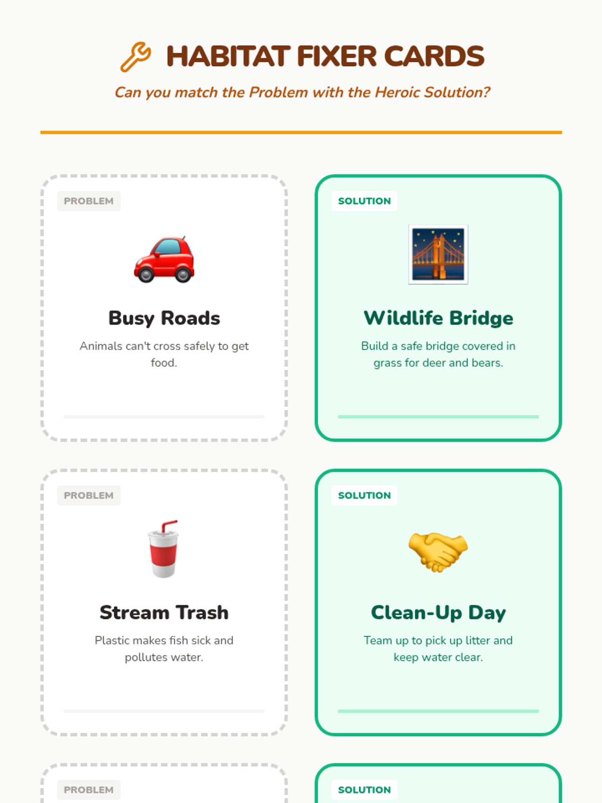 A set of challenge and solution cards for a matching activity. Helps students identify human-caused habitat problems (history/human impact) and modern conservation solutions (science). Designed with large icons and clear text.