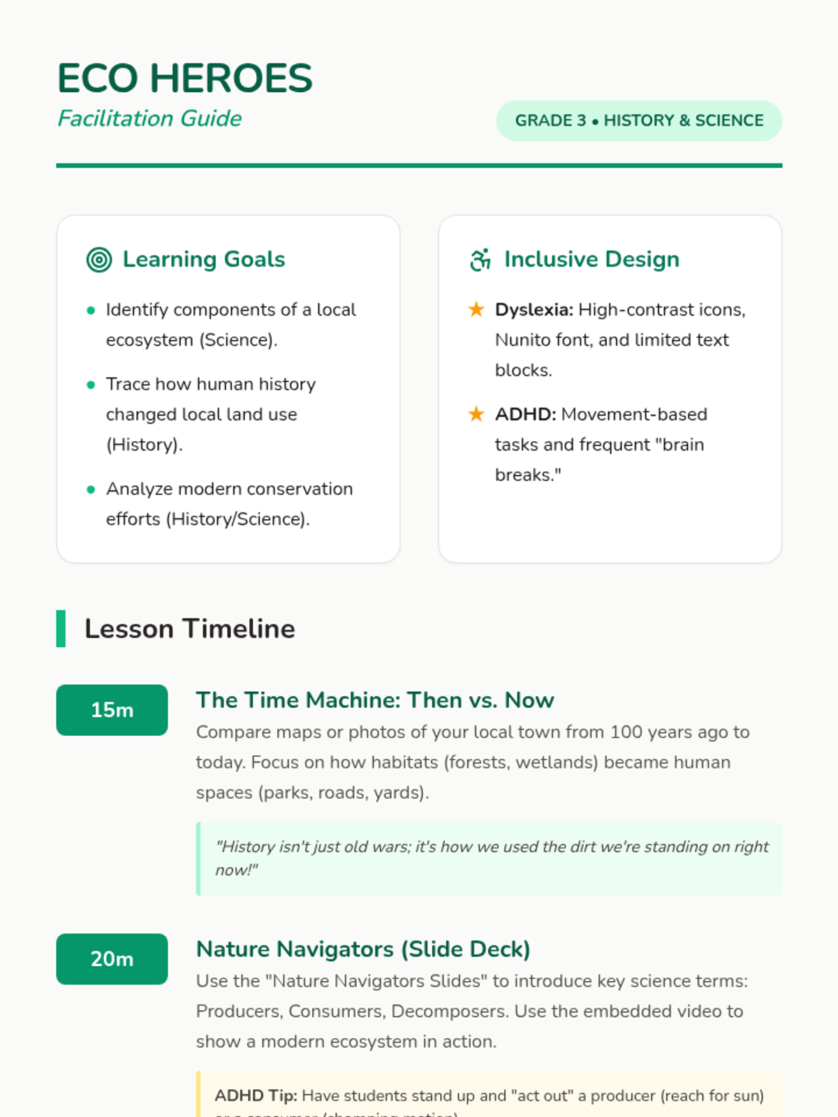A comprehensive teacher's facilitation guide for the Eco Heroes lesson. It includes a detailed timeline, learning goals, discussion prompts, and specific instructional strategies tailored for students with ADHD and Dyslexia.