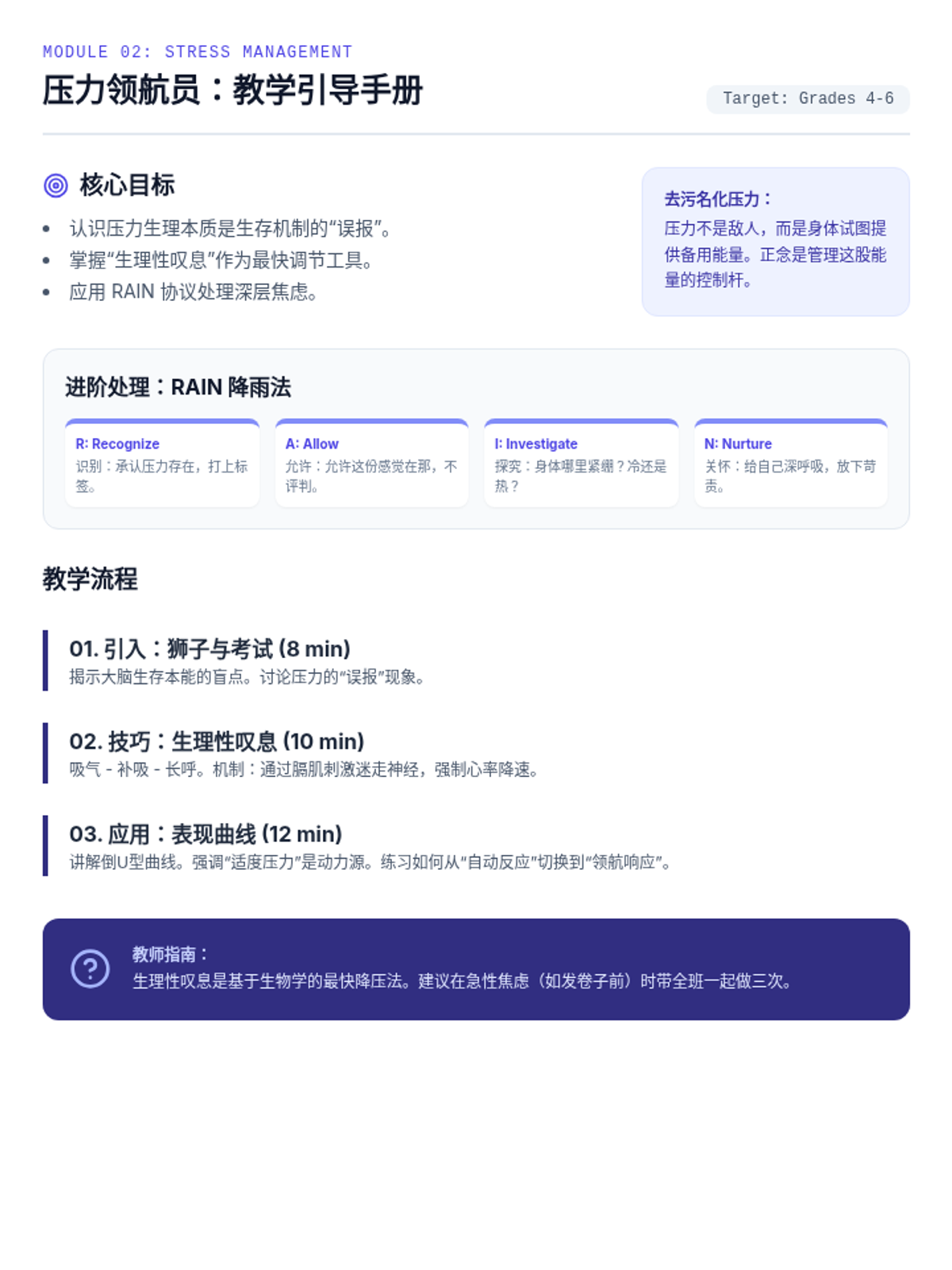 Teacher's facilitation guide for the 'Stress Pilots' lesson (Grades 4-6). Revised to fix markdown syntax, fully define the RAIN protocol, and consolidate all content onto a single page to prevent orphaned sections. Layout tightened for optimal printing.